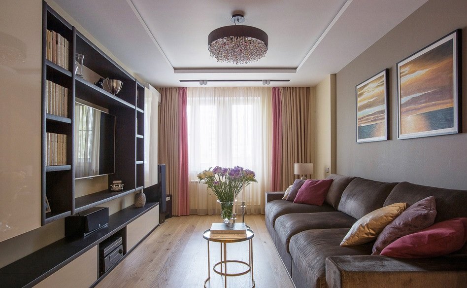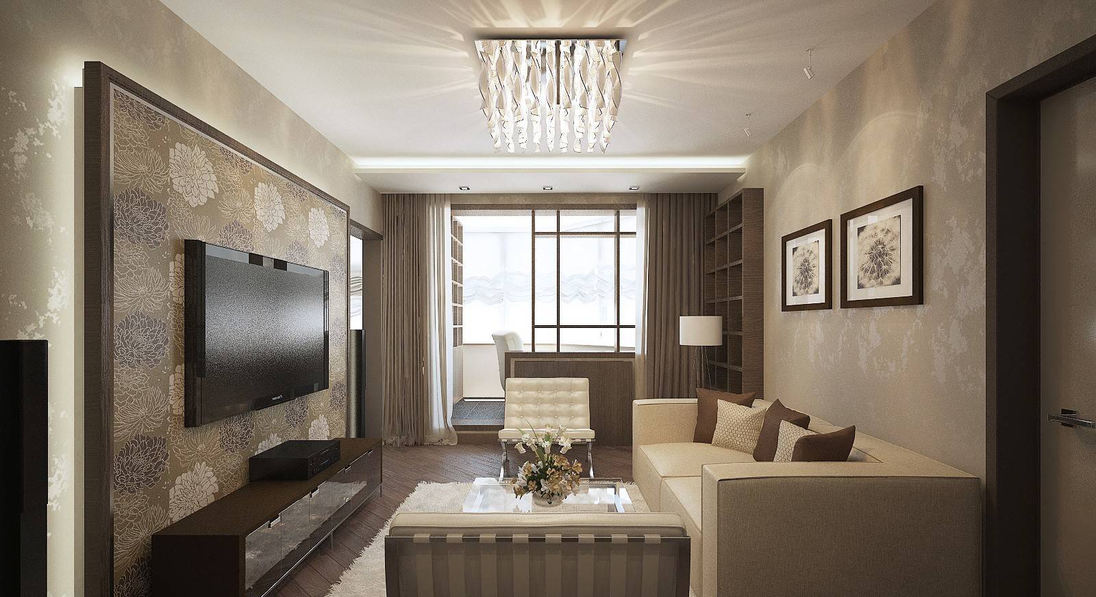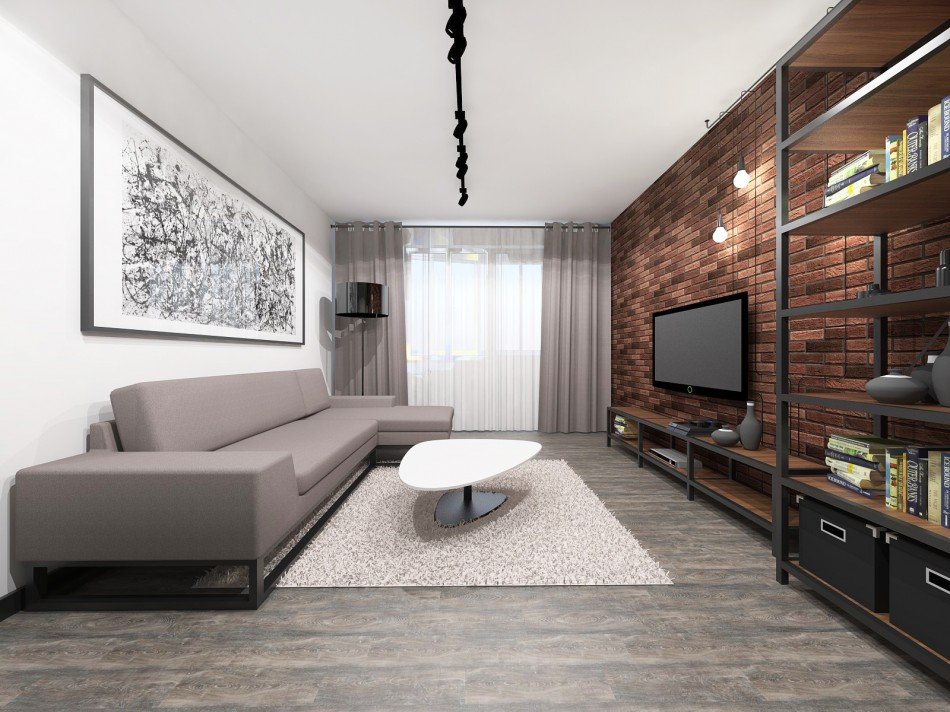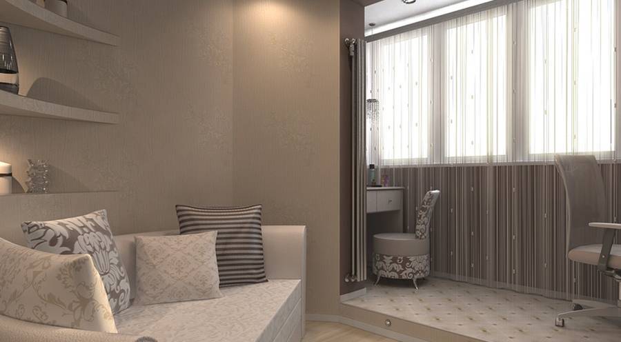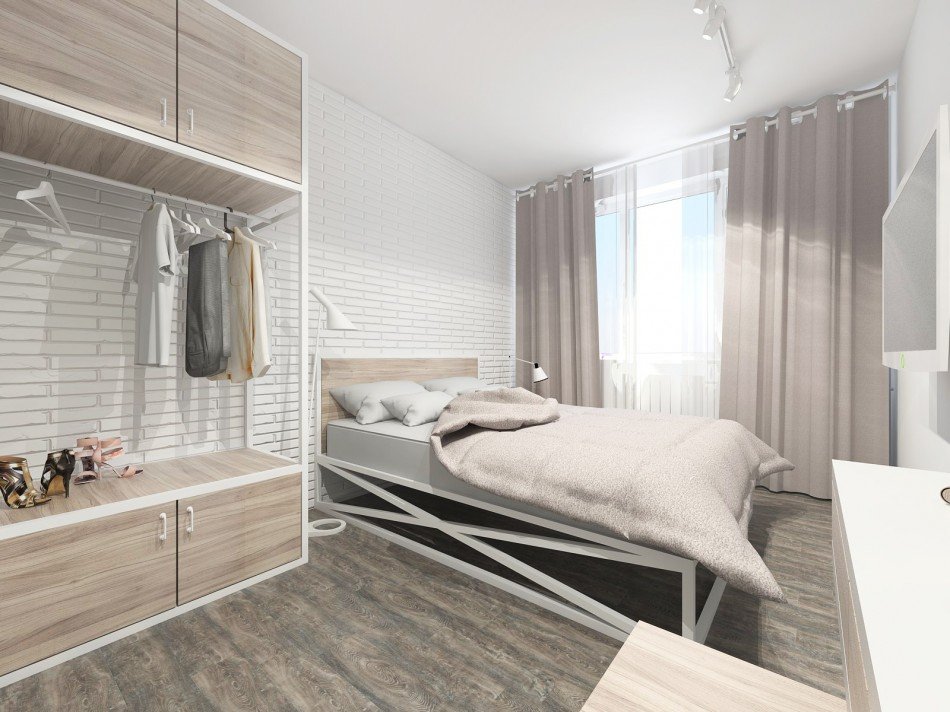 Esta es una solución para una pareja joven sin hijos. Quizás alguien está trabajando desde casa, de forma remota. En este caso, se mantiene la funcionalidad tradicional de las habitaciones. Más pequeño por sq. m la habitación está reservada para el dormitorio, una gran sala de estar. Aquí los propietarios podrán organizar reuniones con amigos. Un gran sofá de esquina con almohadas decorativas es apropiado en el pasillo. El pasillo está separado de la sala por una barra de bar sorda. Es conveniente colocar su oficina en casa en una logia acristalada.