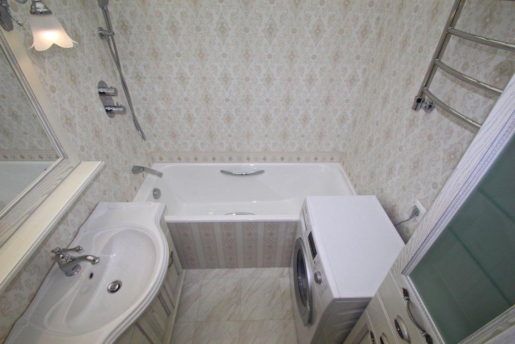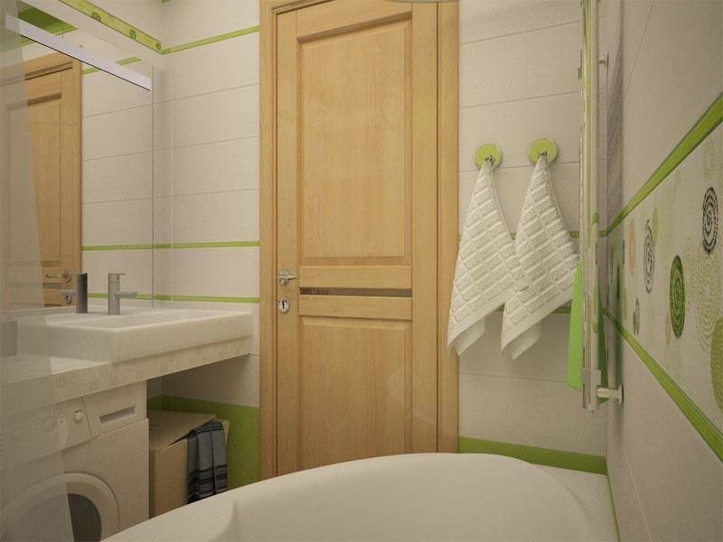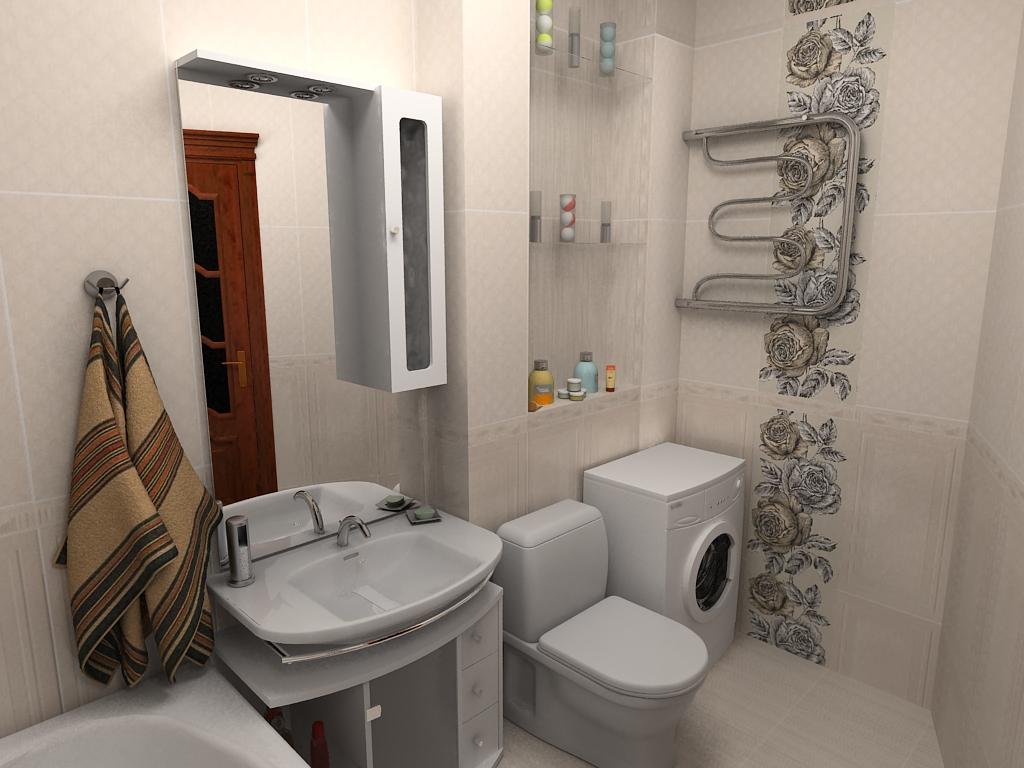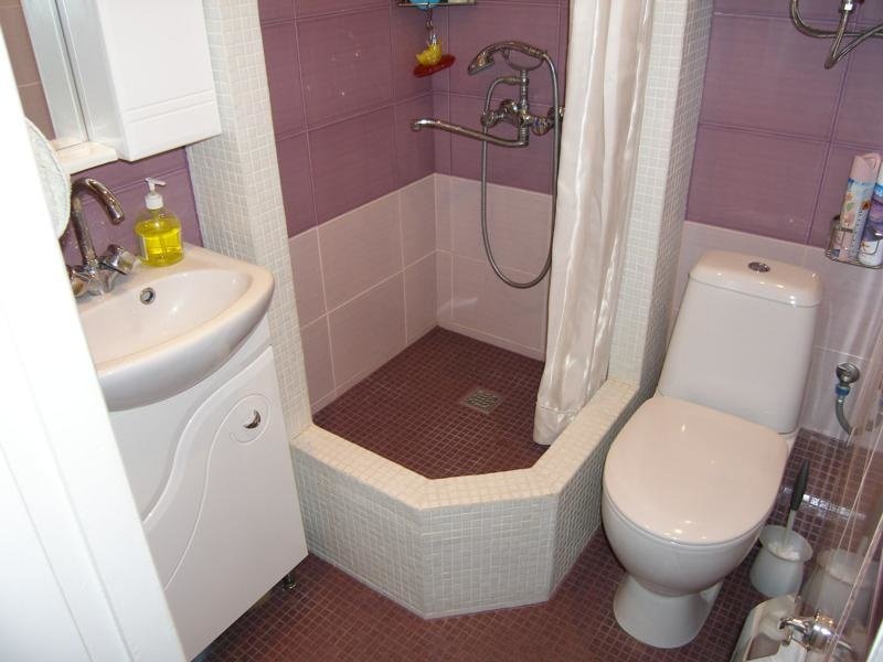 Si monta la cabina de ducha en lugar del inodoro, se libera una parte significativa del espacio en la esquina opuesta. Alberga una encimera de esquina y un fregadero incorporado. Debajo hay un lugar para una lavadora de tamaño pequeño. El baño se transporta a una pared adyacente.