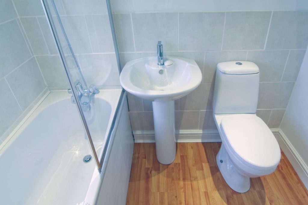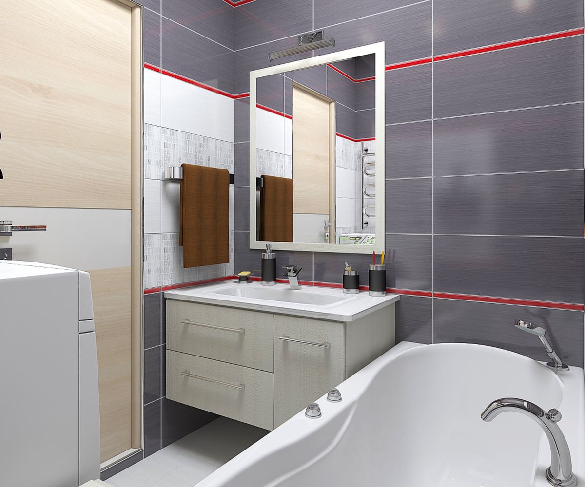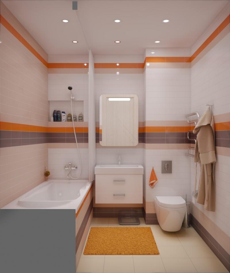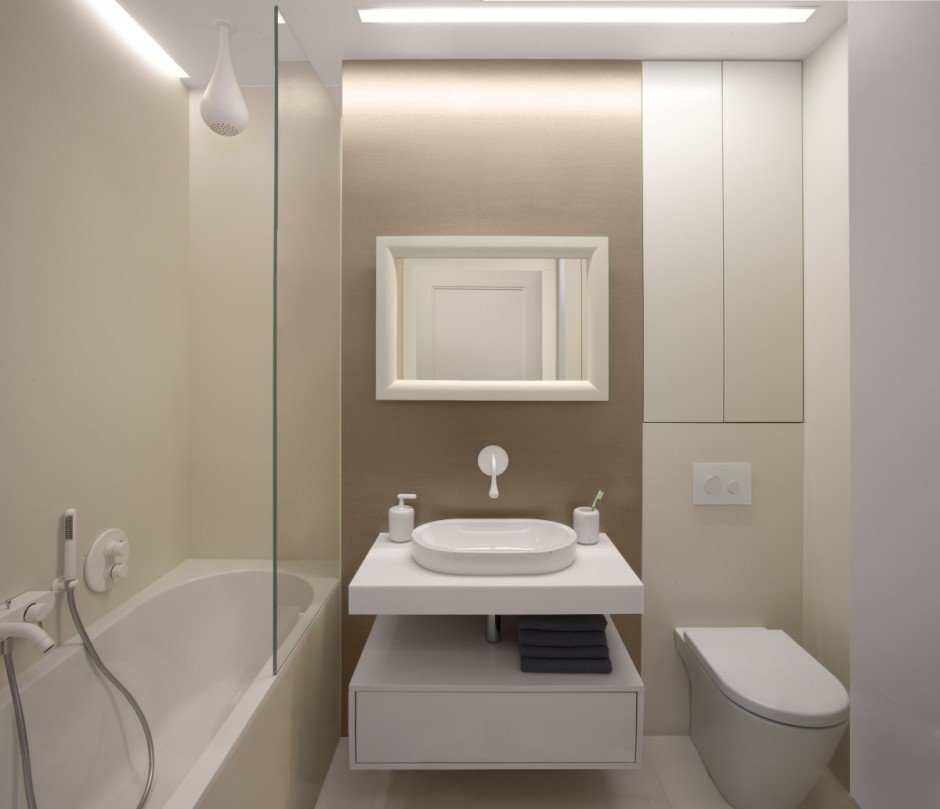 No siempre es posible combinar dos habitaciones. En este caso, para ganar espacio, es aconsejable colocar una cabina con ducha o bañera paralela a la puerta. El diseño de la tubería está oculto detrás de la pantalla decorativa. Dado que las habitaciones no son espaciosas, se recomienda utilizar el diseño colgante del lavabo y el inodoro.