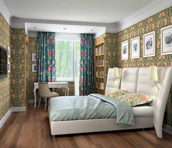 El fondo básico para toda la vivienda está unificado (generalmente neutral), y una pared en cada habitación está pintada de colores brillantes o empapelada con un patrón que coincida con el estilo.