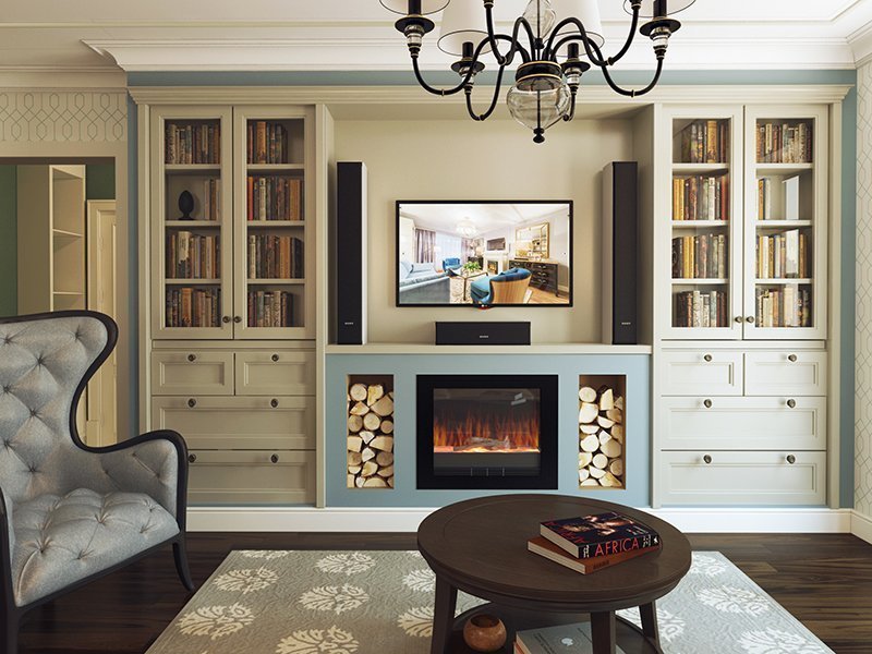 La parte sobresaliente de la habitación es un excelente lugar para colocar una chimenea eléctrica. Es completamente seguro y cumple con los detalles de una ventana salediza.