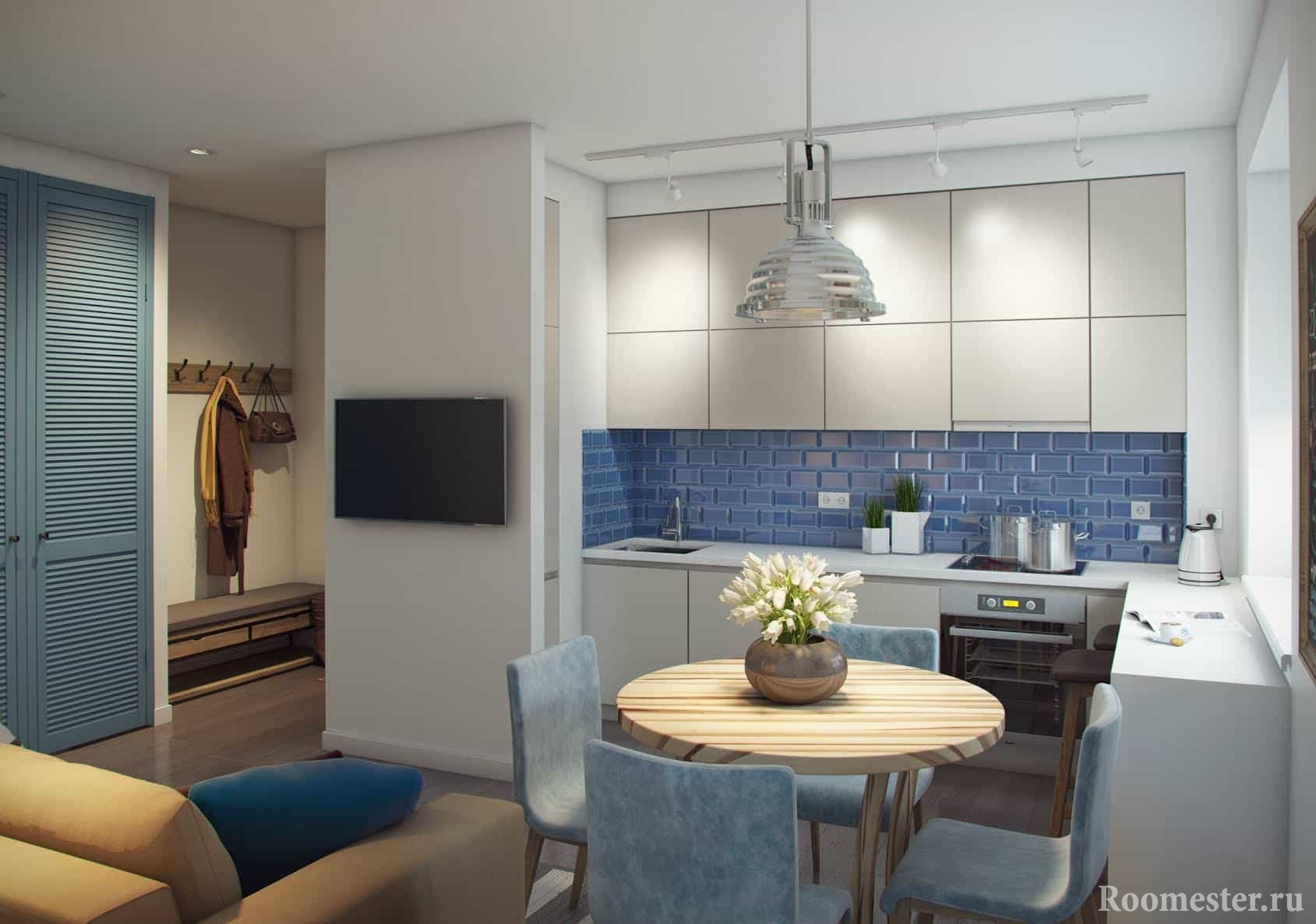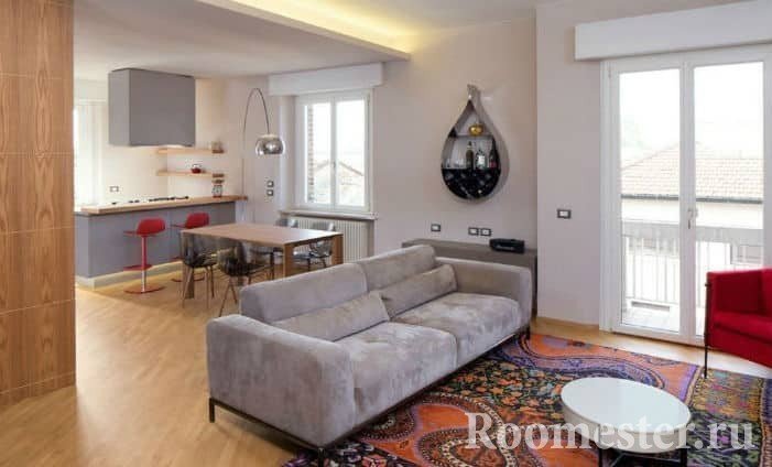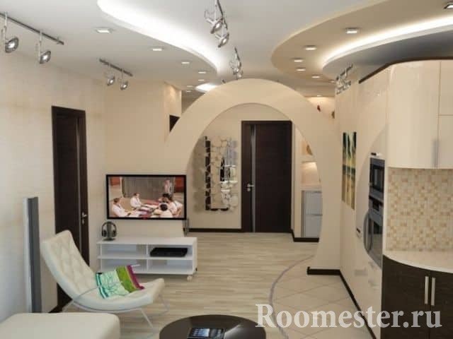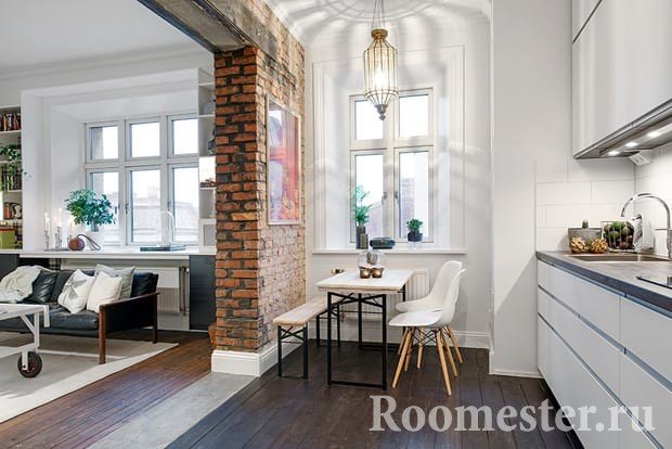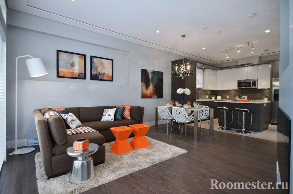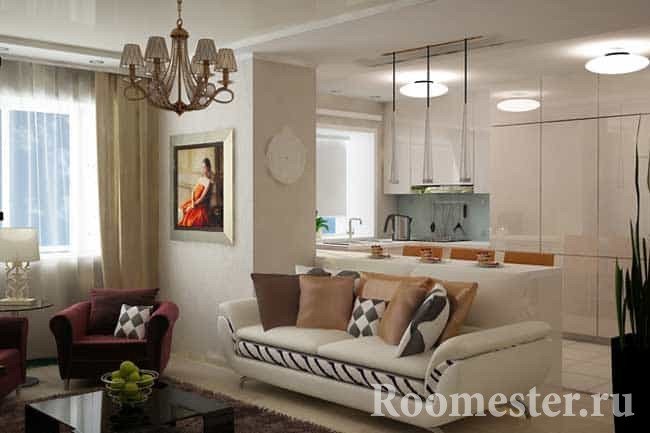 La más popular es la integración de un área de alimentos con un pasillo. Y esto significa que para conectarse, necesitará la cocina junto con la sala de estar, lo que afectará los pasillos con el pasillo. Pero hay un "pero". De acuerdo con las regulaciones actuales, una sala de estar con cocina gasificada no se puede combinar, a menos que establezca al menos una división mínima entre ellas. Los diseñadores ayudarán con esta pregunta. Incluso si el cliente está en contra de dicha partición, hay muchas opciones para vencerlo de manera diferente.