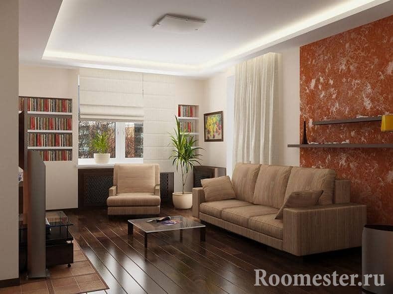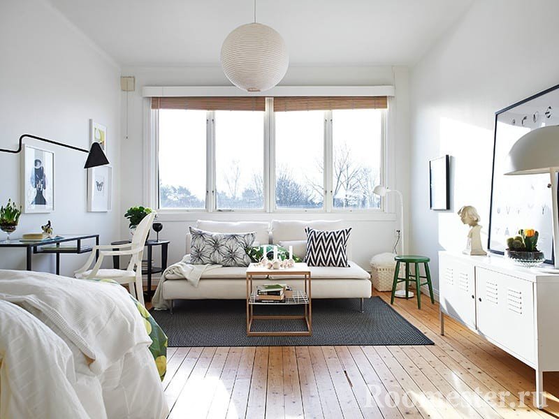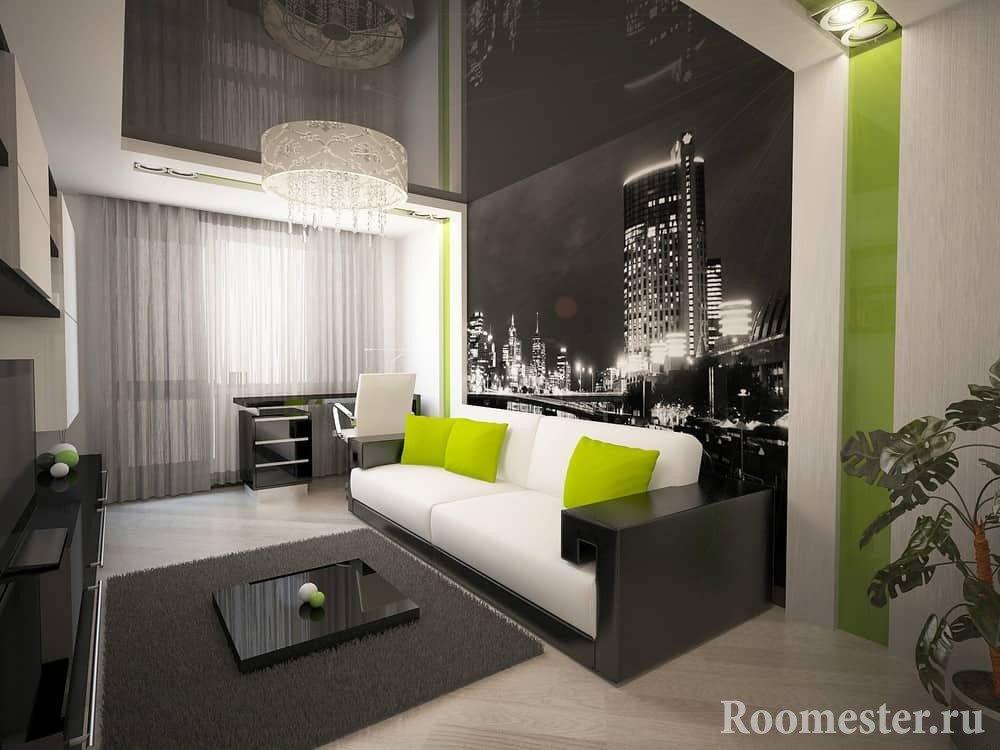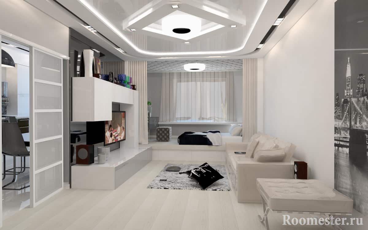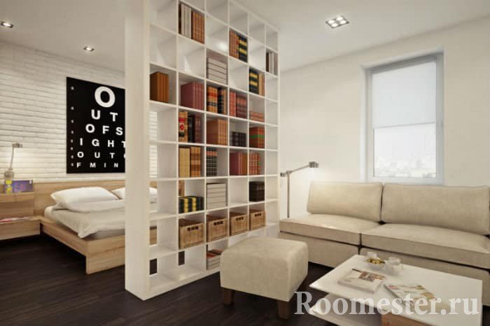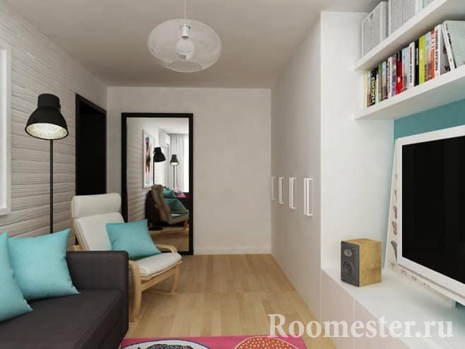 Tal modificación como la zonificación de la sala de estar: el dormitorio está disponible en el caso de que se dé la segunda habitación para planificar una guardería. Los muebles modulares donde la cama se transforma en un sofá o armario ayudará a lograr un buen resultado. Hay otra opción para separar también el área de relajación y el dormitorio condicional con una partición decorativa, creando la ilusión de una habitación separada. El área de la oficina puede crear una partición decorativa en las esquinas.