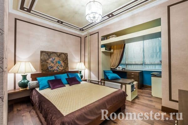 El armario del dormitorio no es un buen ejemplo de planificación. Pero si este es un punto clave, puede seleccionar una zona para la oficina.Será conveniente si coloca una cama transformadora para que se pliegue en un armario.