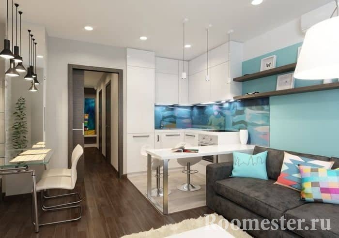 Por lo general, cuando se crea un diseño interior para apartamentos de dos habitaciones, se consideran dos de las opciones de rediseño más populares: la destrucción de la pared que separa el espacio habitable del resto y el área de la cocina. En pocas palabras, tenemos un montón de espacio libre, donde hay un lugar para una zona de comida, en otras palabras, un comedor. De hecho, solo hay dos habitaciones: un dormitorio y una sala común, que combinan una cocina, un pasillo, un comedor y una sala de estar. Por supuesto, tal elección es muy buena, excepto por un punto: cuando los invitados se acercan a los propietarios, no habrá lugar para ubicarlos, y esto crea un pequeño inconveniente.