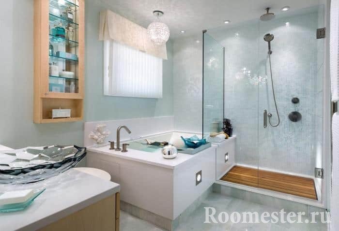 Para que el baño combinado contenga no solo funcionalidad, sino también estética, se recomienda separar la bañera y el inodoro con iluminación. Se pueden colocar lámparas y bombillas sobre el lugar donde se encuentra el baño.
