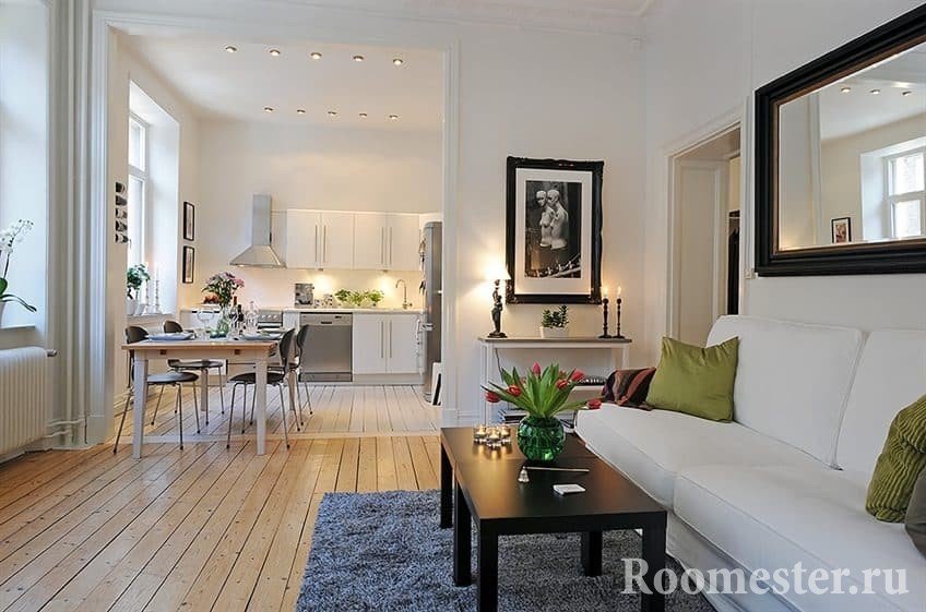 El estilo escandinavo se caracteriza por el laconismo, la simplicidad. Este estilo ligero y flexible se adapta absolutamente a cualquier hogar, ya sea una casa privada o un apartamento en miniatura. Aquí, todos los elementos interiores no son así, cada uno de ellos representa algún tipo de función. No hay cosas sin sentido en tales casas. Este estilo es del agrado de muchos, ya que con él puedes lograr la comodidad, dar comodidad al hogar. La dirección es inherente a una gran cantidad de espacio libre, la luz. A menudo resulta mejor que el interior de un apartamento de dos habitaciones con una sala de estar y cocina.