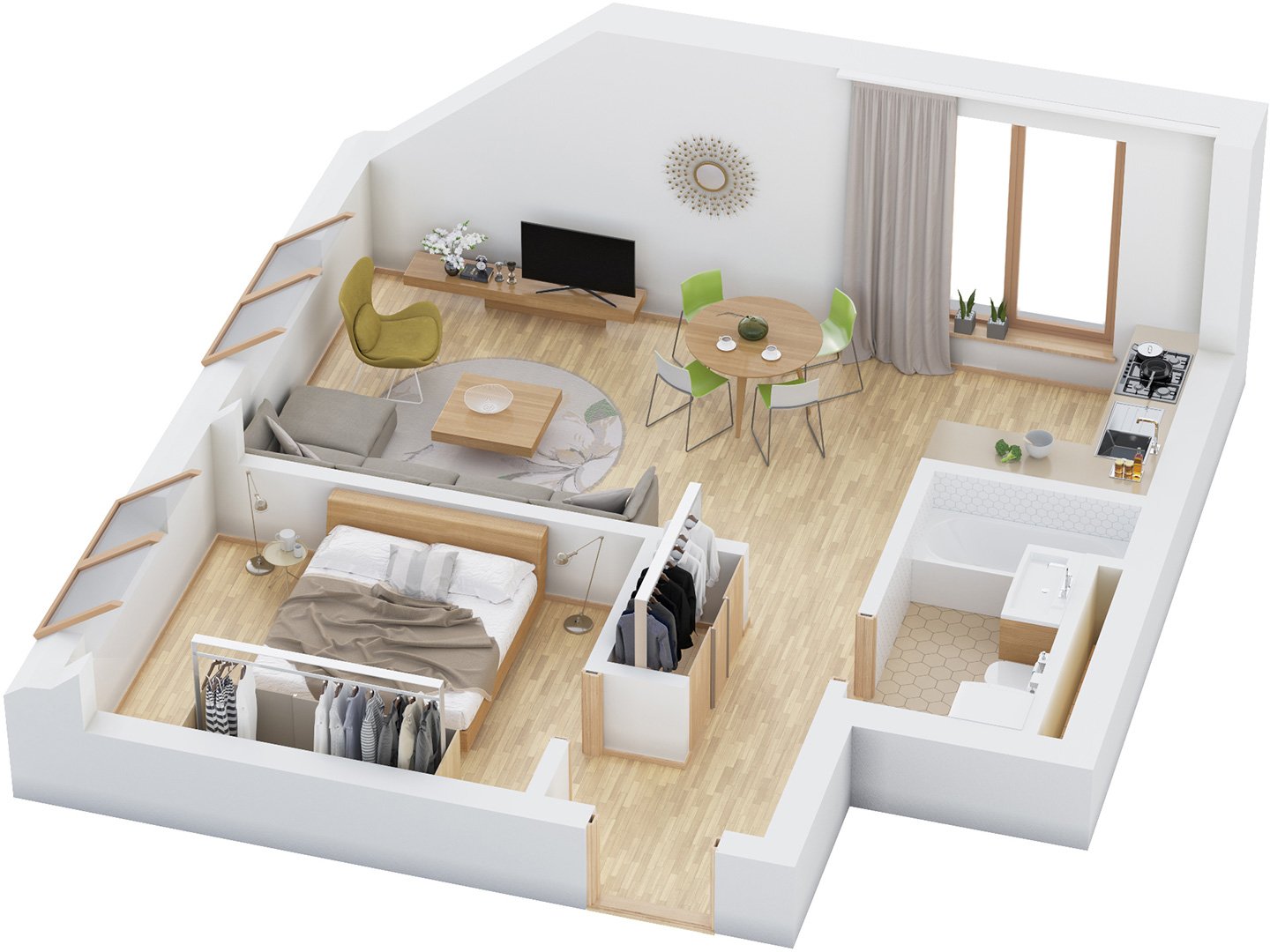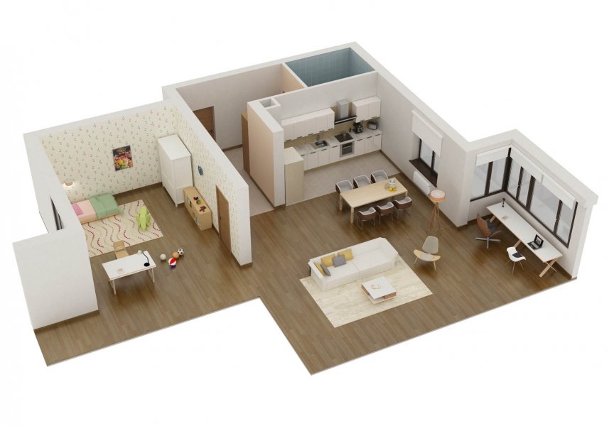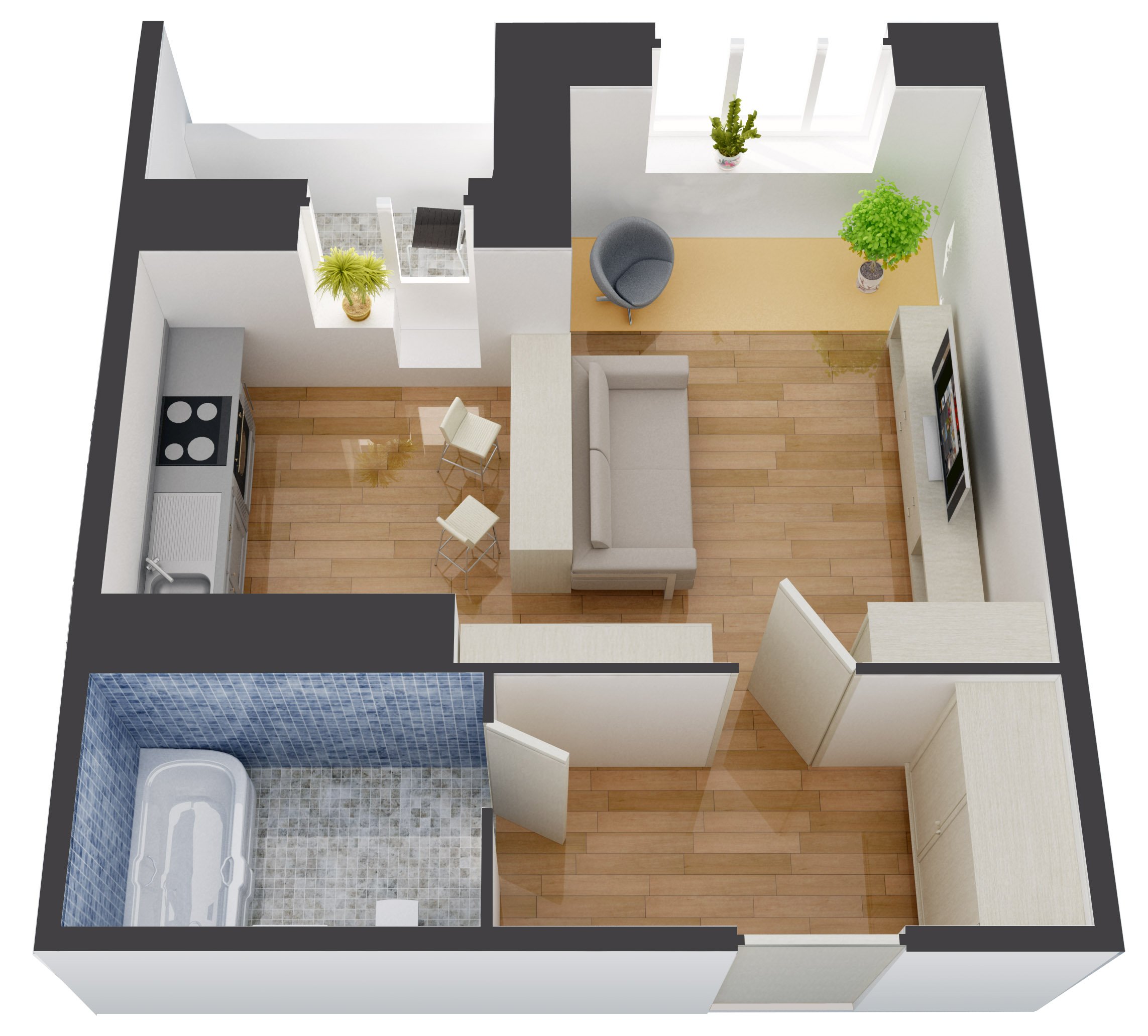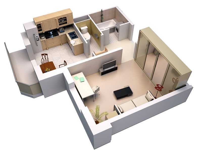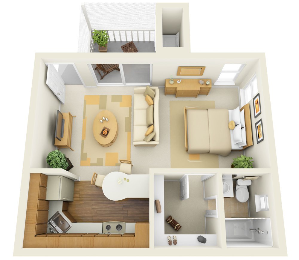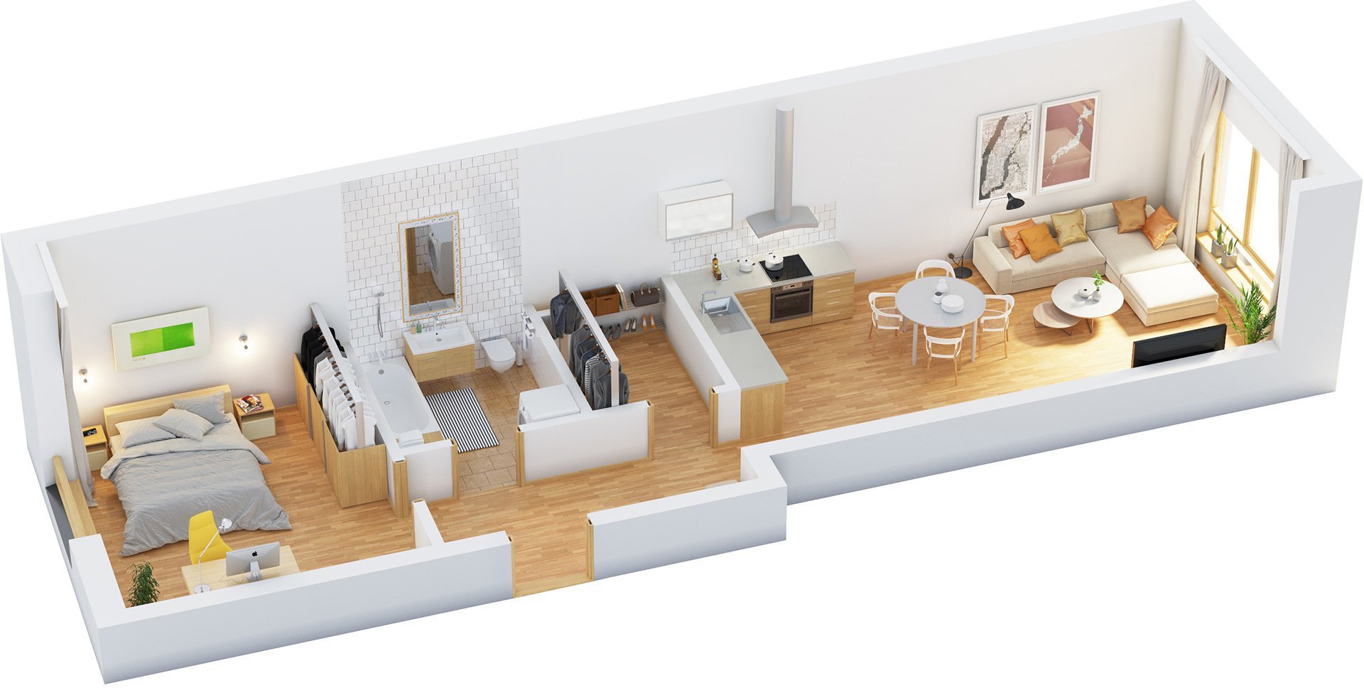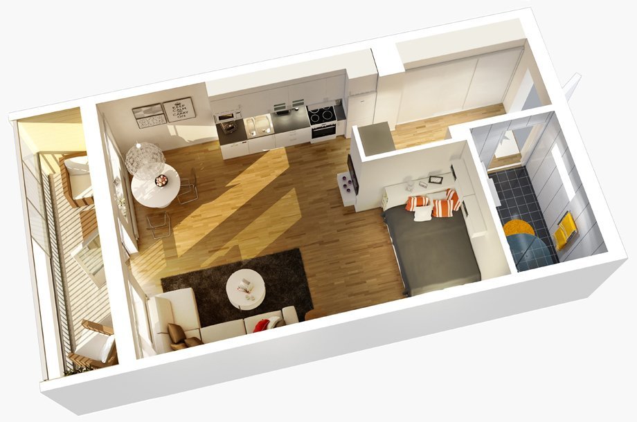 El estudio está dividido en 3 áreas funcionales: sala, comedor y cocina. Puede espaciar el espacio de las siguientes maneras: