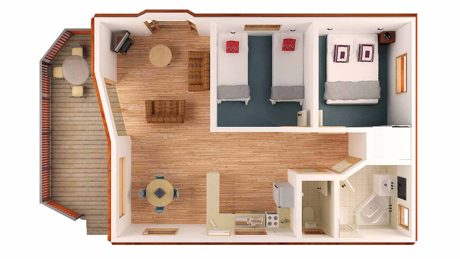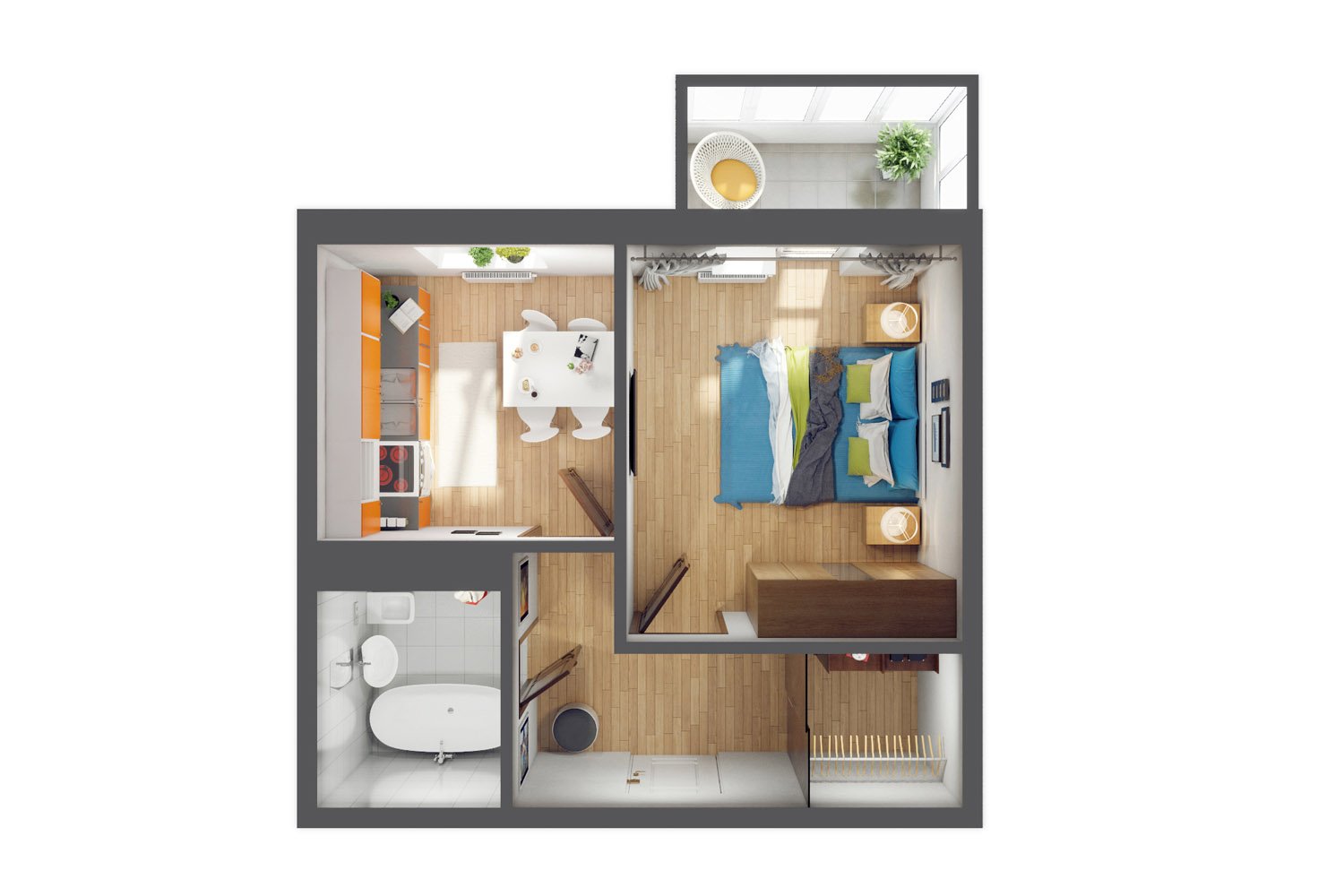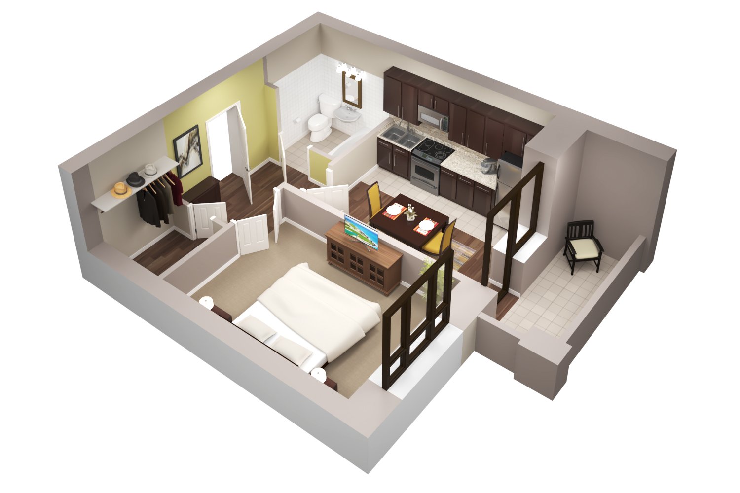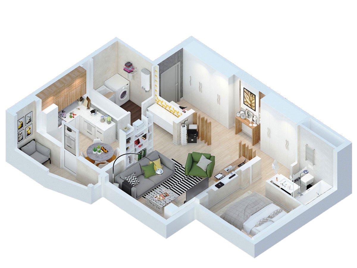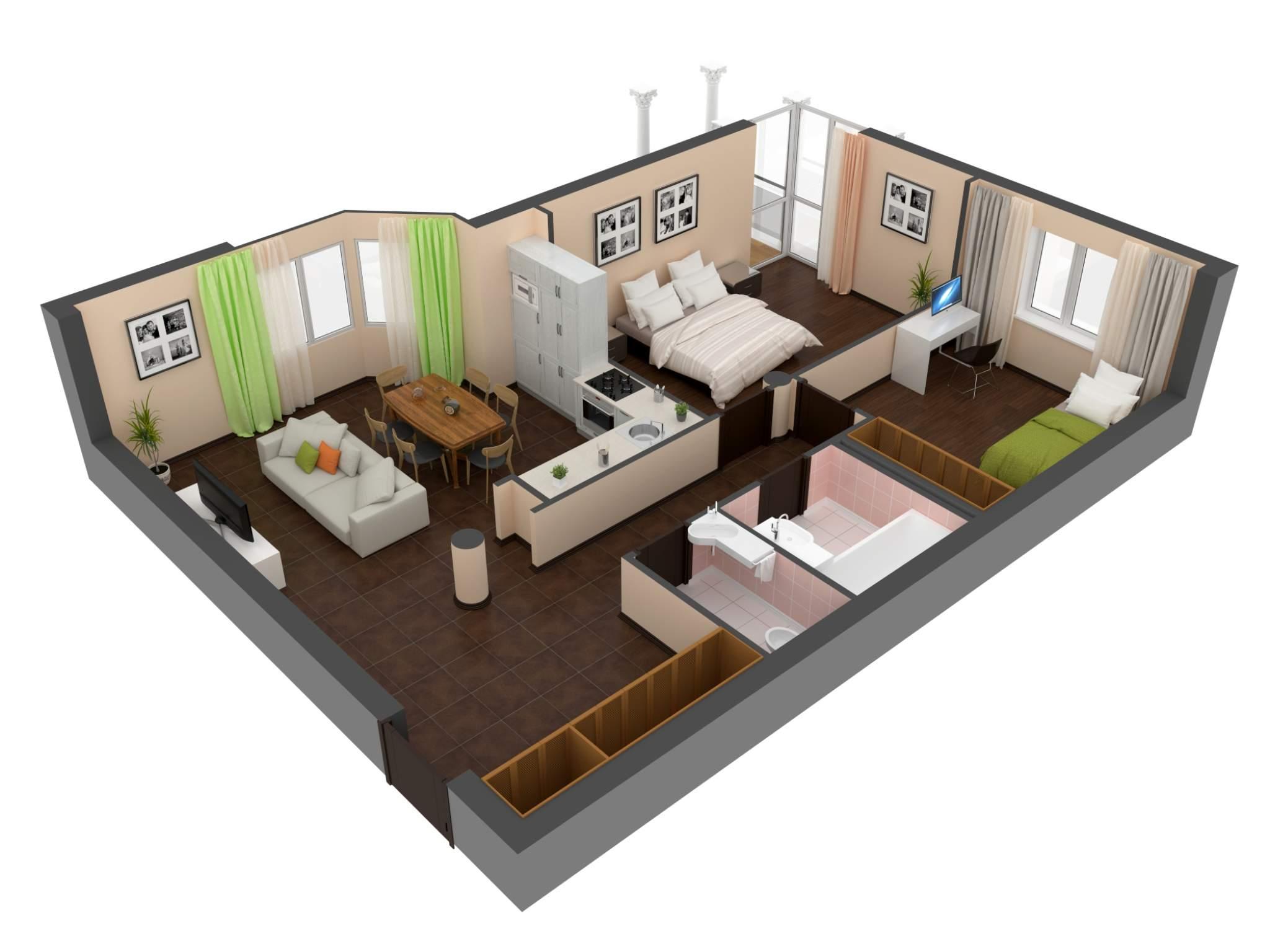 El estudio está dividido en 3 áreas funcionales: sala, comedor y cocina. Puede espaciar el espacio de las siguientes maneras: