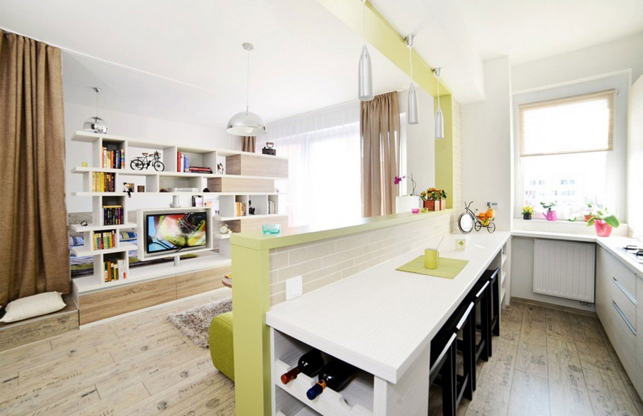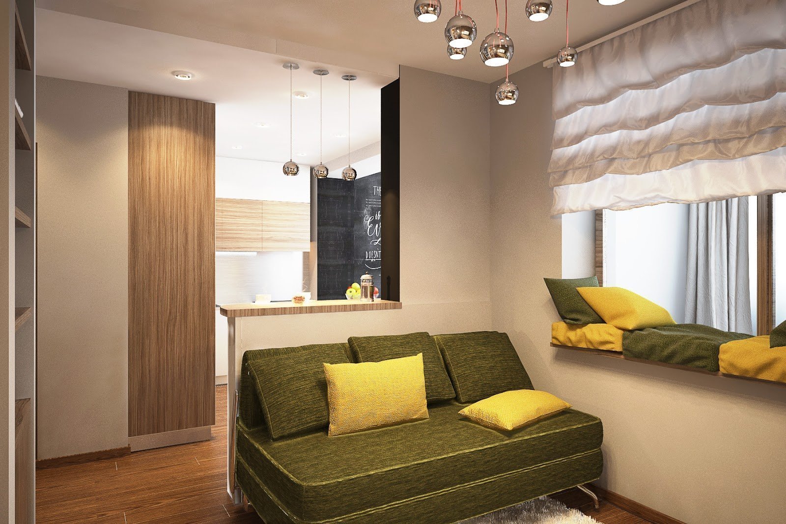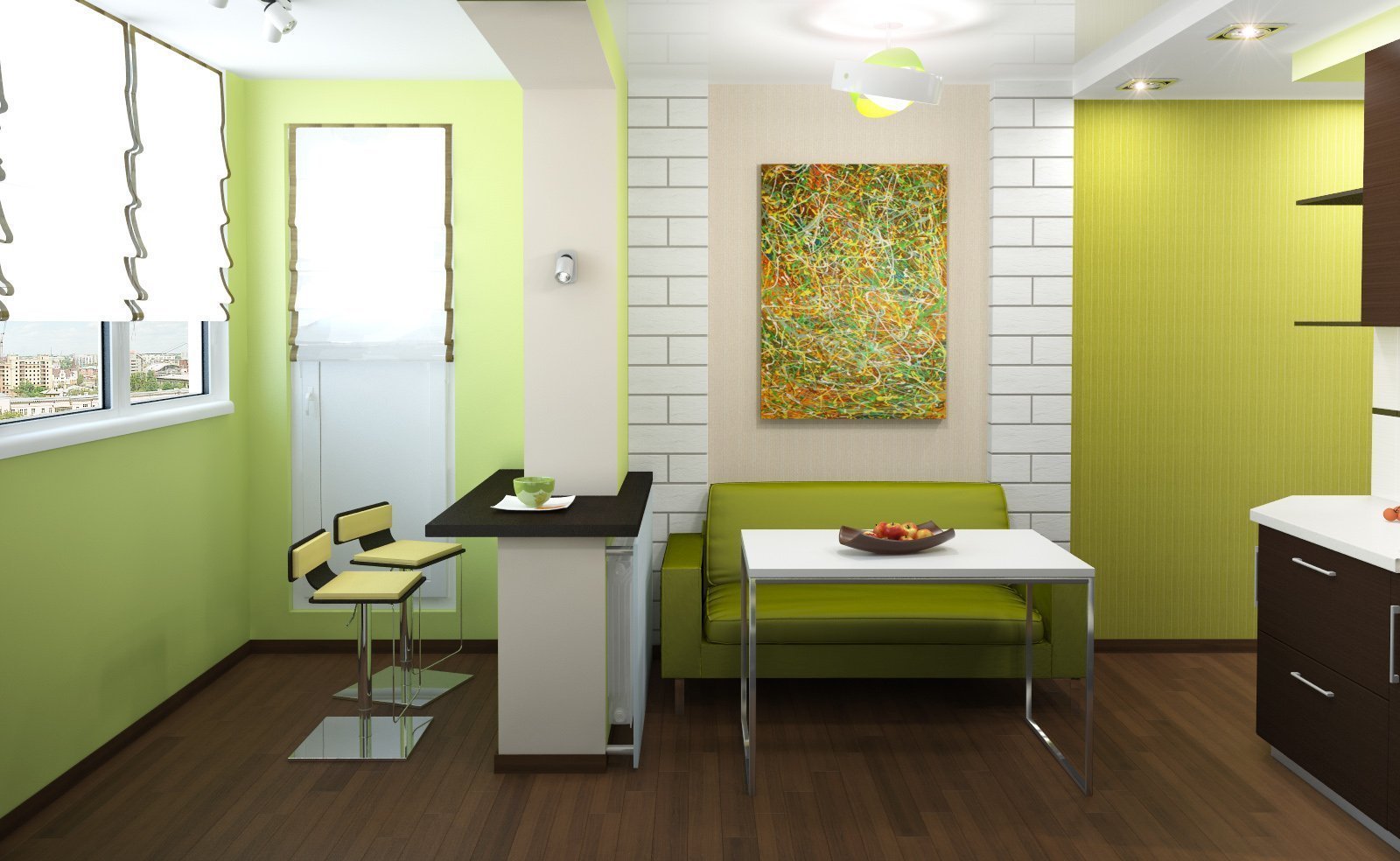 Salón-cocina. Aquí el área del sofá y la cocina se separan con diferentes colores. Los revestimientos de paredes en la cocina son de color verde hierba. Las paredes de la sala son de color amarillo huevo.