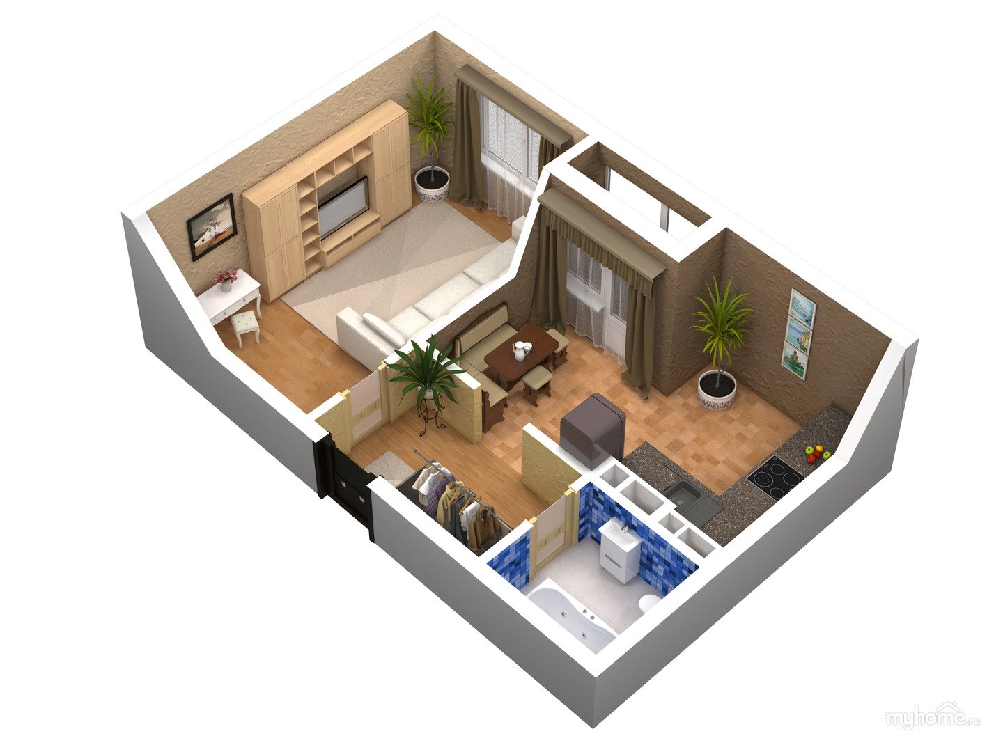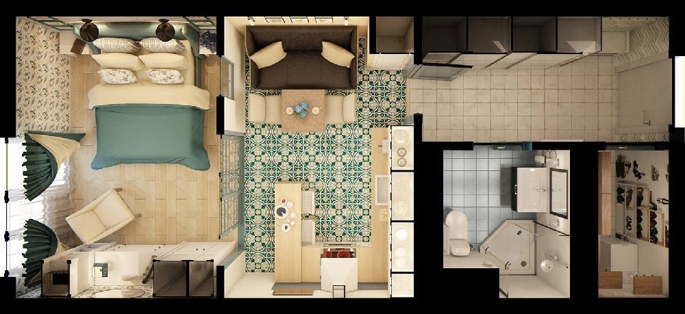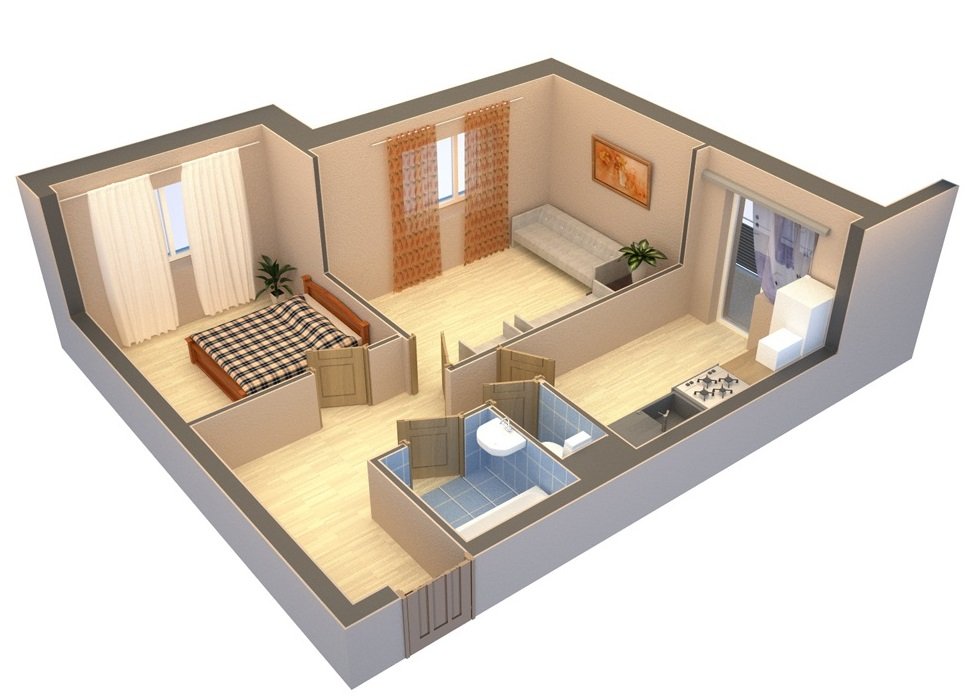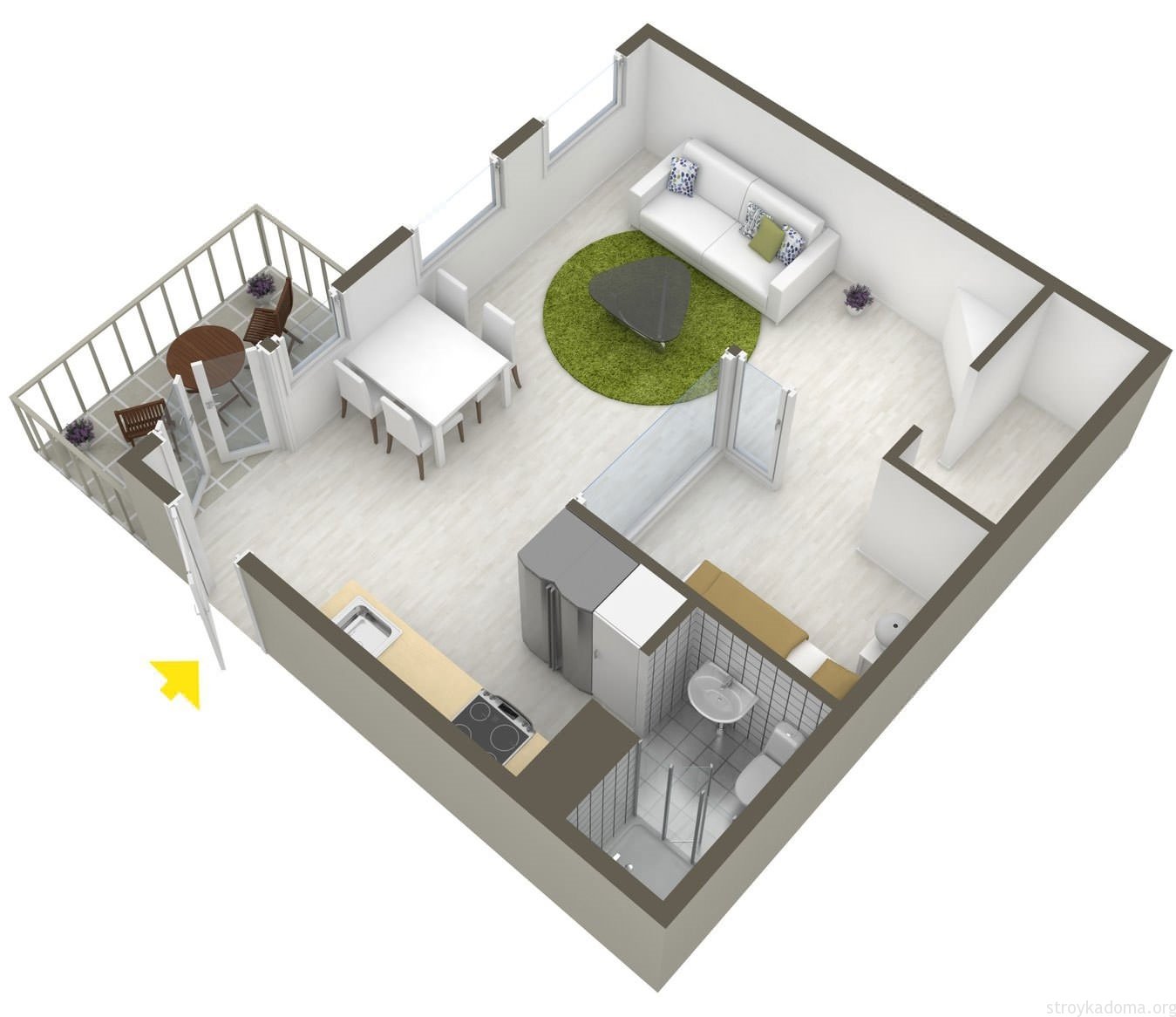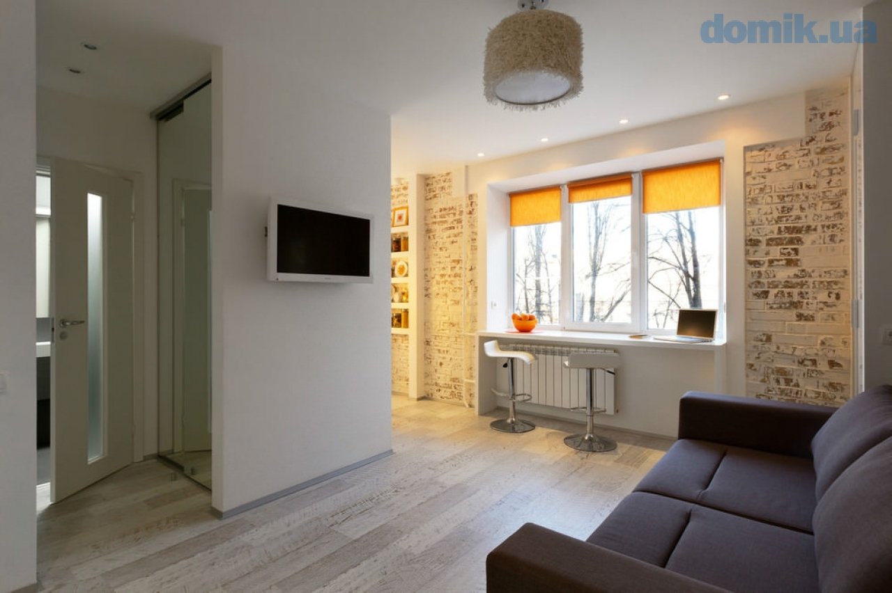 Un requisito previo para el estudio es una campana extractora potente en la cocina, de lo contrario se acumulará condensación en la habitación y literalmente preservará el olor a comida. El verdadero problema es el baño. La mejor solución para odnushka es un baño y un inodoro combinados. Si estas dos habitaciones están separadas, puede eliminar la partición o instalar una lavadora en ella.