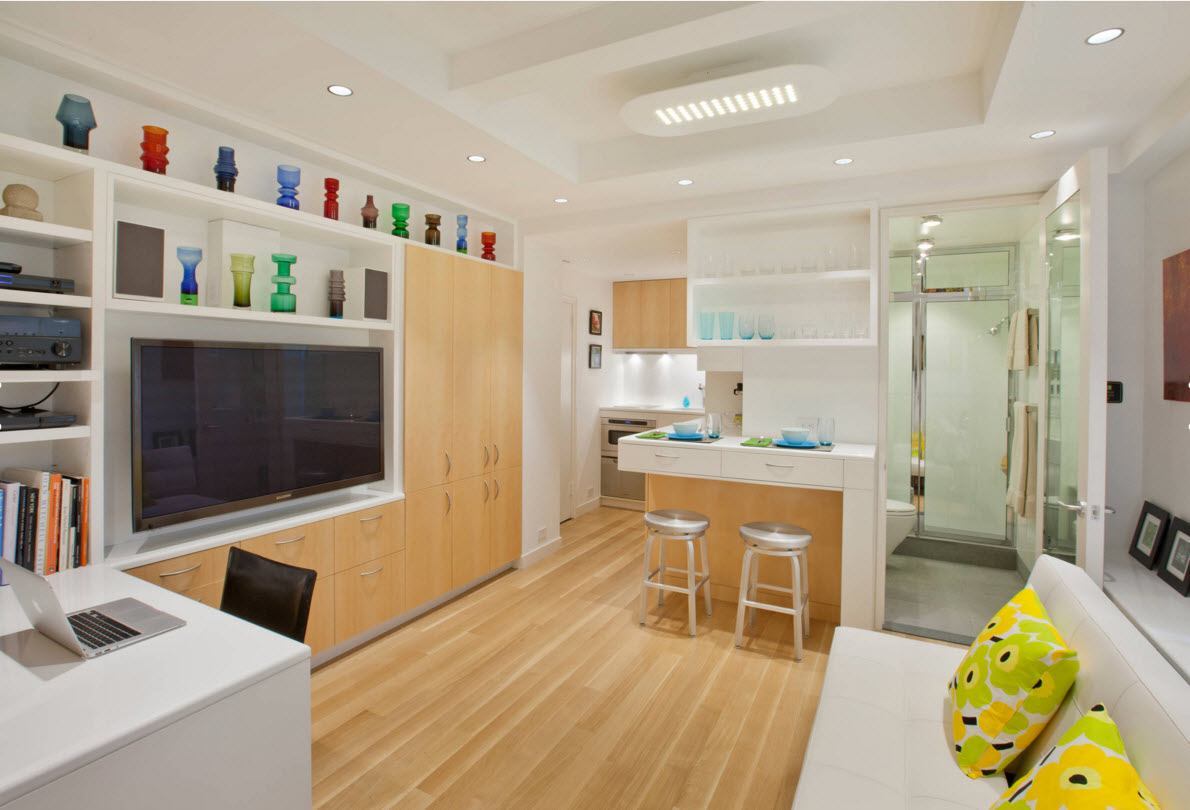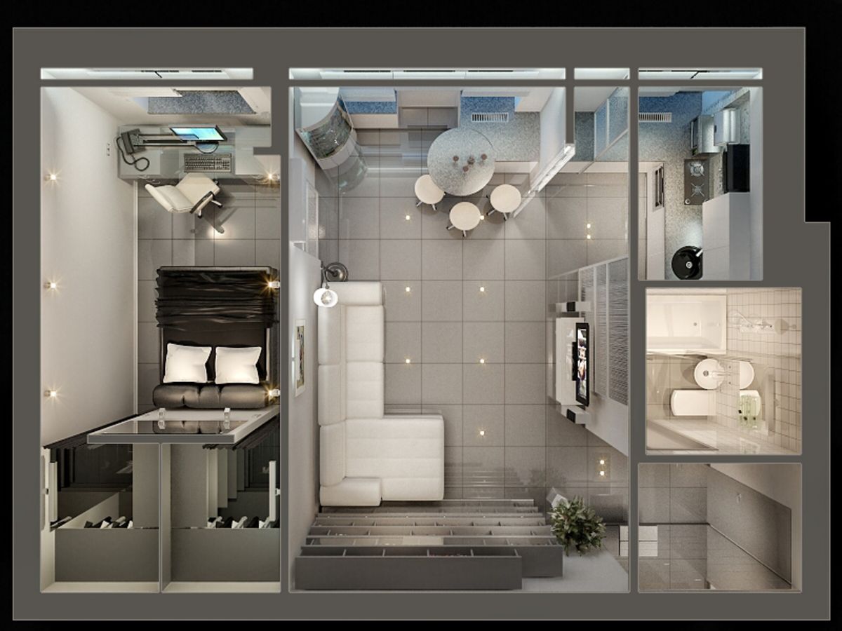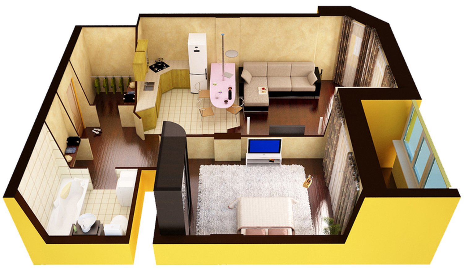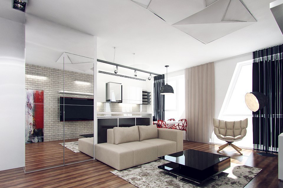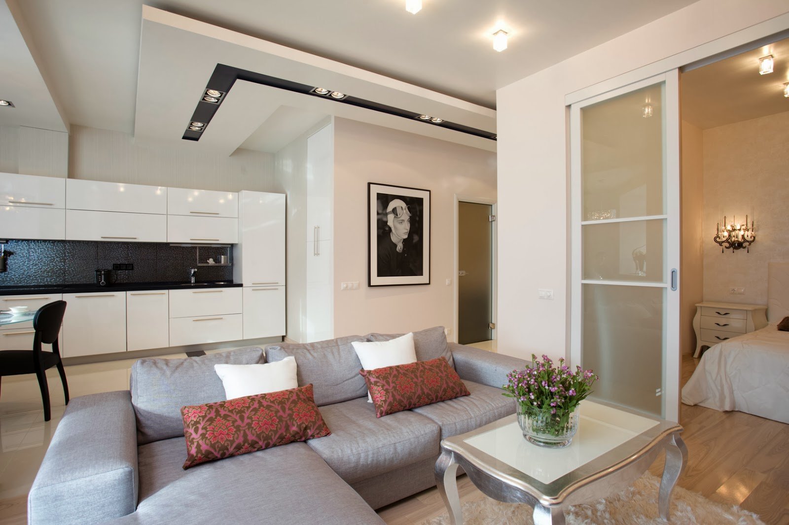 Studio es una solución común al espacio útil. La práctica muestra que es más conveniente y moderno que un apartamento clásico de una habitación.Si eliminamos la pared que separa la habitación de la cocina, obtenemos una habitación espaciosa, que permanece dividida en varias zonas diferentes. Al mismo tiempo, el fregadero y la estufa permanecen en su lugar. La estufa solo se puede mover si es eléctrica.
