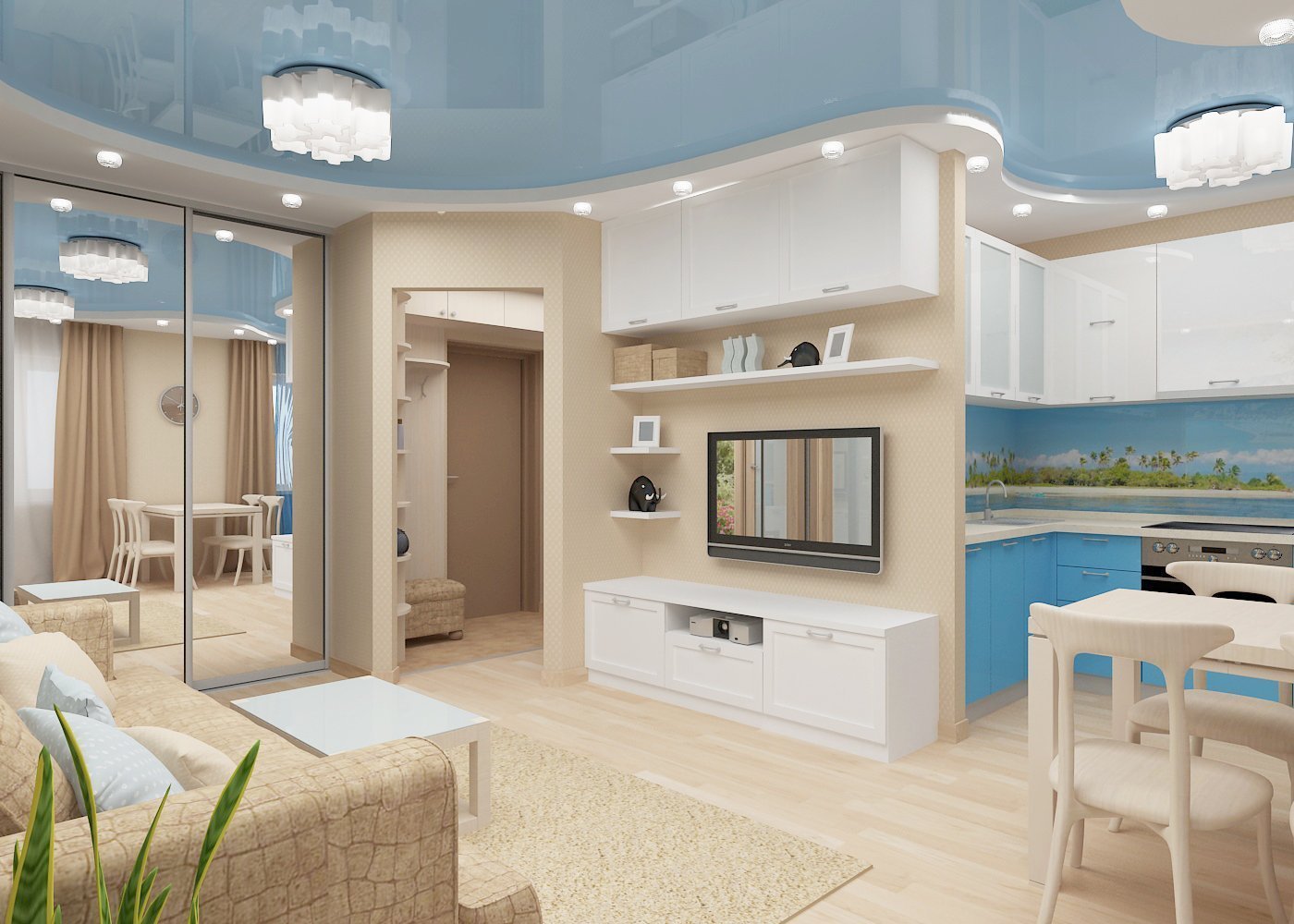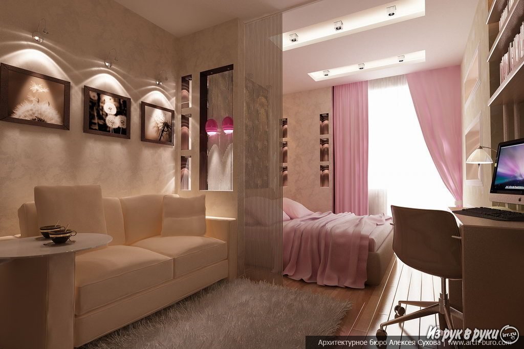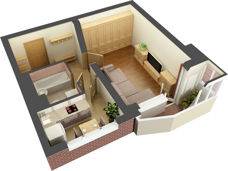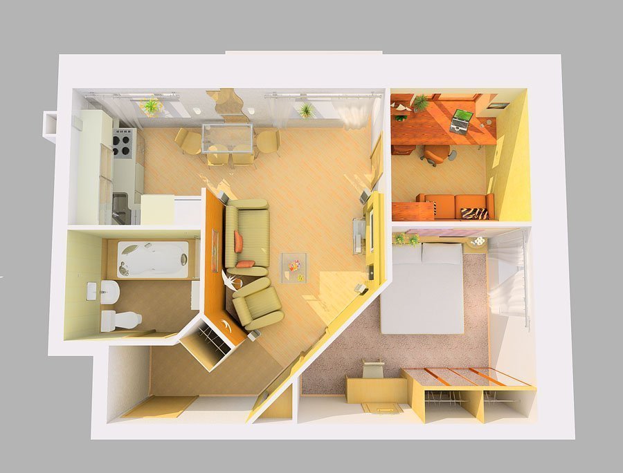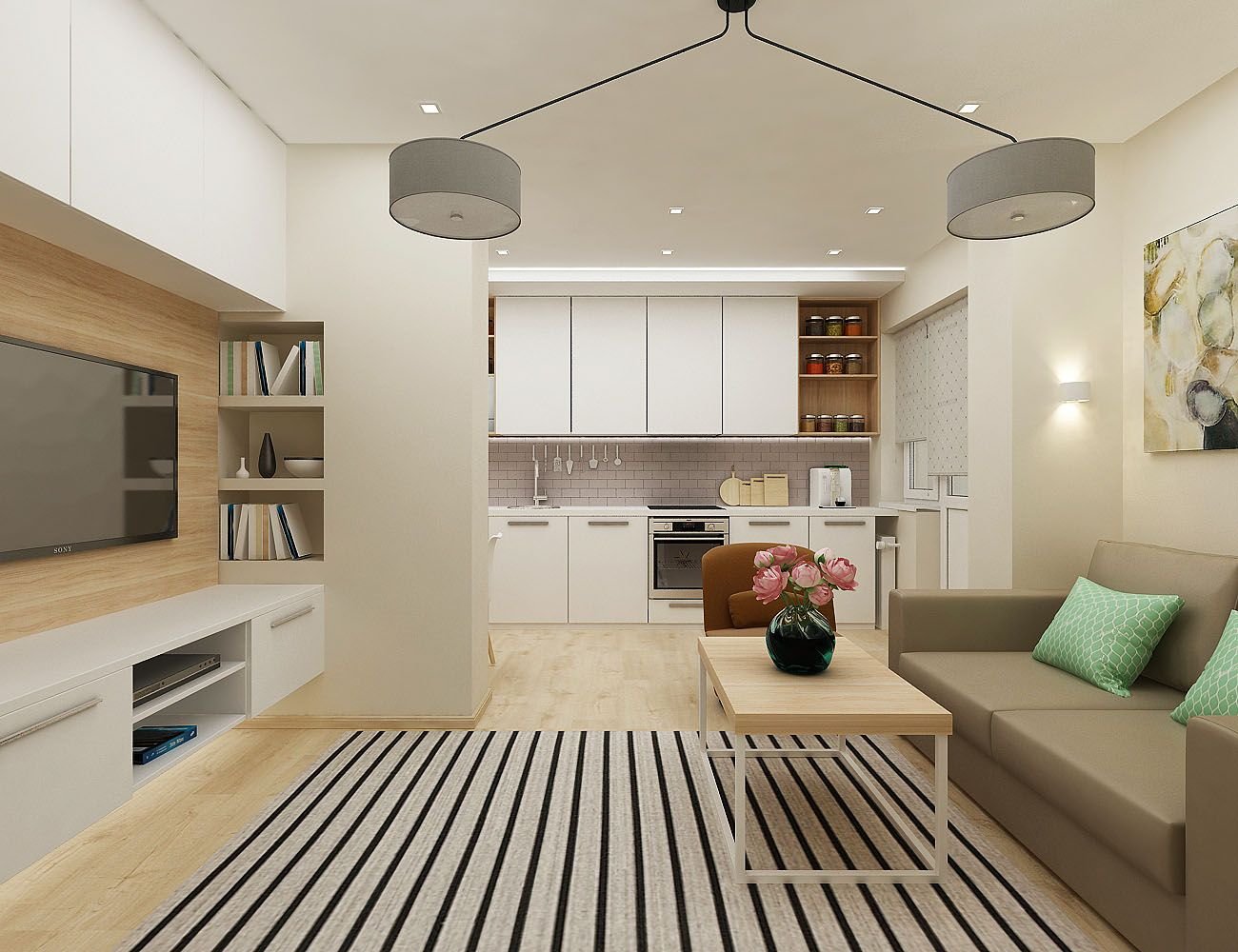 Studio es una solución común al espacio útil. La práctica muestra que es más conveniente y moderno que un apartamento clásico de una habitación.Si eliminamos la pared que separa la habitación de la cocina, obtenemos una habitación espaciosa, que permanece dividida en varias zonas diferentes. Al mismo tiempo, el fregadero y la estufa permanecen en su lugar. La estufa solo se puede mover si es eléctrica.