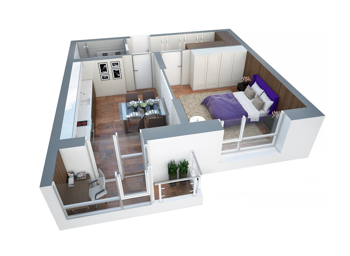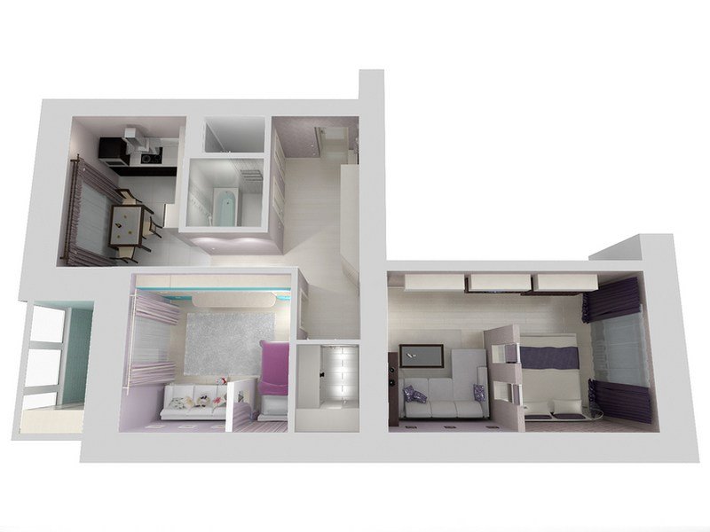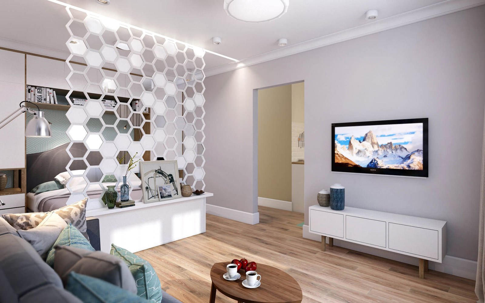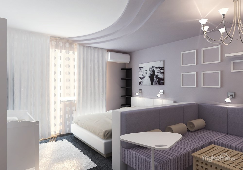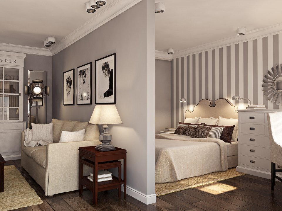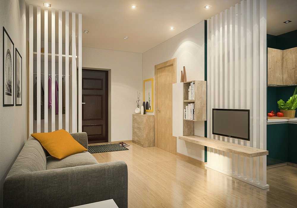 Este momento, la división de un área pequeña en habitaciones, es el más crucial. Esto es lo que sucedió con la división de toda el área en zonas funcionales, un ejemplo del diseño: