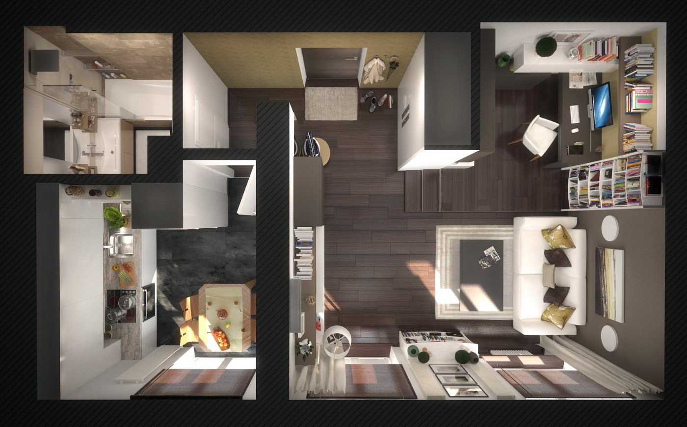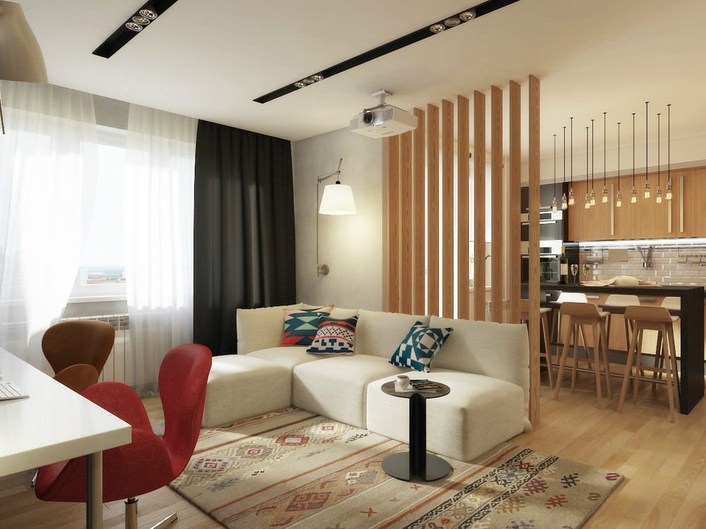 Como cualquier tarea, la creación de un proyecto de diseño comienza con una condición. Entonces, dado: familia, 3 personas.Pareja casada e hijo 3 años. Los chicos son activos, les encanta viajar, su casa siempre está abierta para invitados. Requisitos para el interior: dinamismo, que refleja su estilo de vida, diseño moderno y, si es posible, no estándar. Por lo tanto, es necesario equipar un espacio pequeño para la vida familiar y asignar espacio adicional para acomodar a familiares o amigos que llegaron.