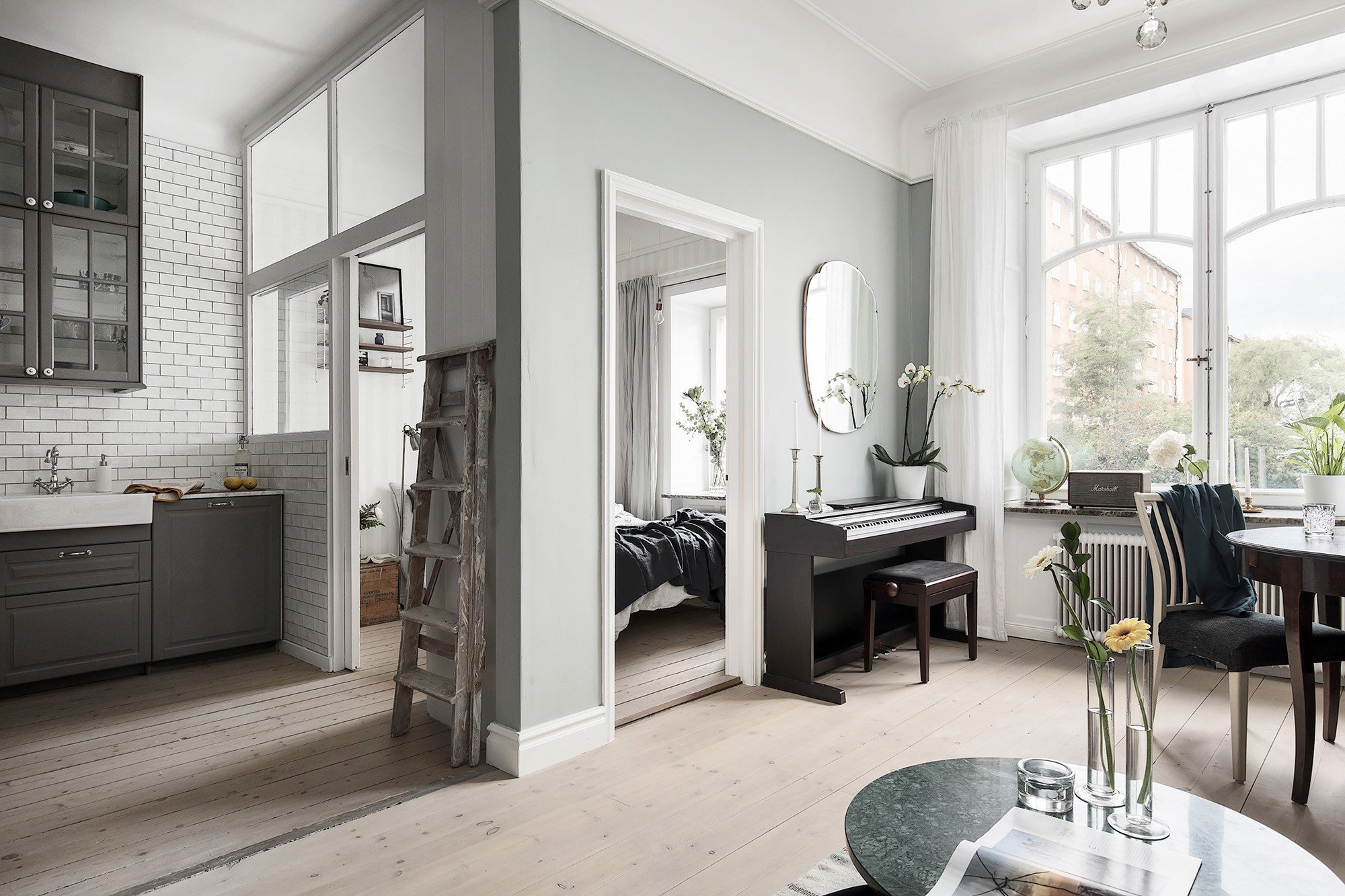 El estilo sueco no incluye cortinas (a los norteños les encanta y saben apreciar el sol). Si esta opción no le conviene, puede usar persianas enrollables o persianas, blancas o de un tono contrastante.