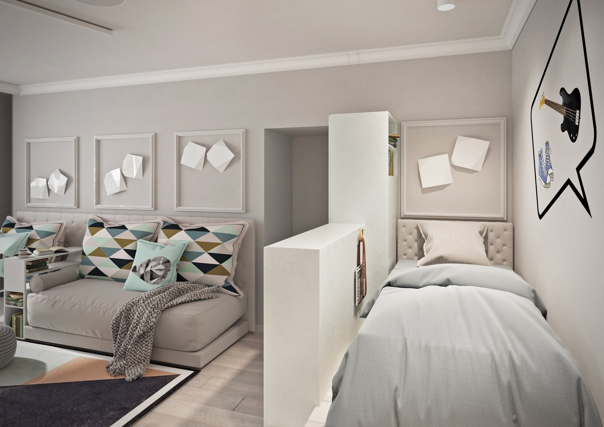 Los muebles para la guardería son clásicos. Está algo fuera de la imagen minimalista general, pero la conveniencia está a la vanguardia. Este es un armario blanco para guardar cosas de niños, una cama convertible y un pequeño sofá. Había un lugar aquí para un caballete en miniatura con lápices de colores para dibujar, y para una mesa, en la que puedes esculpir, leer y participar en la creatividad de los niños.