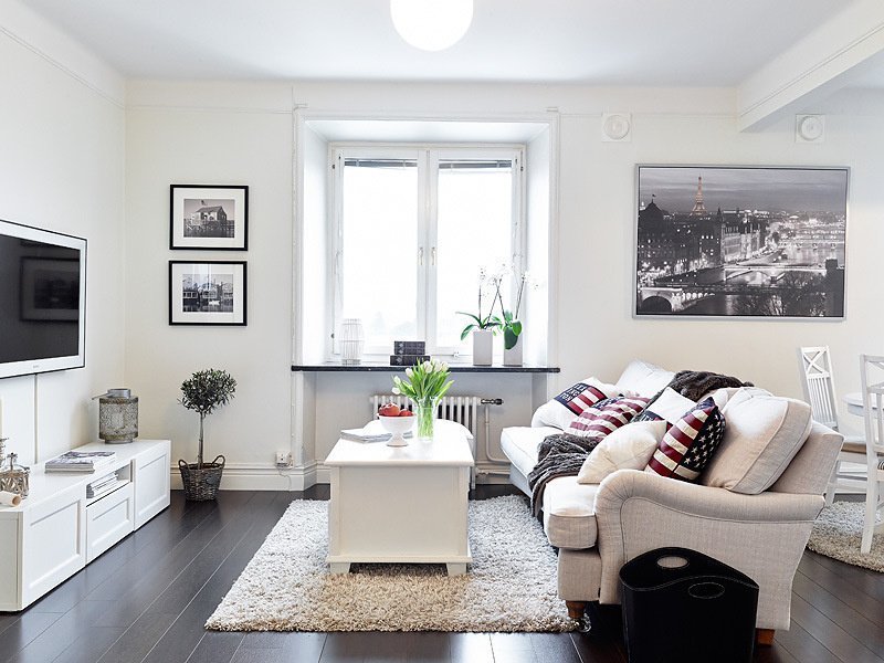 Las opciones de tres habitaciones son menos comunes, ya que tienen habitaciones demasiado pequeñas. Dada la escasez de metros cuadrados, uno tendrá que luchar por la apertura del espacio, del que originalmente estaba privado. El arsenal tiene un dormitorio, una sala de estar, una habitación para niños y un triple de habitaciones obligatorias: un baño, una cocina, un hall de entrada. Una solución real sería combinar dos habitaciones en una. Desafortunadamente, la demolición de los muros no siempre está permitida, por lo que construiremos sobre lo que tenemos. La pequeña sala de estar estará decorada de acuerdo con los principios del minimalismo.
