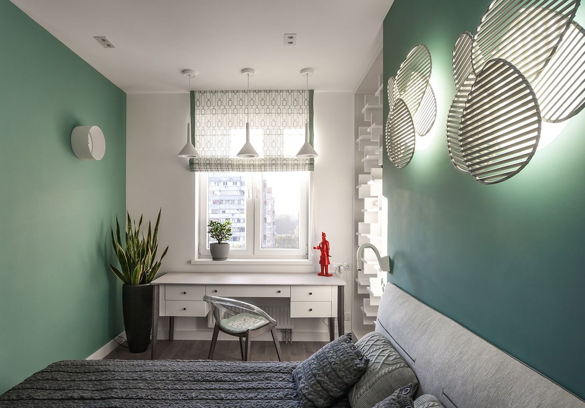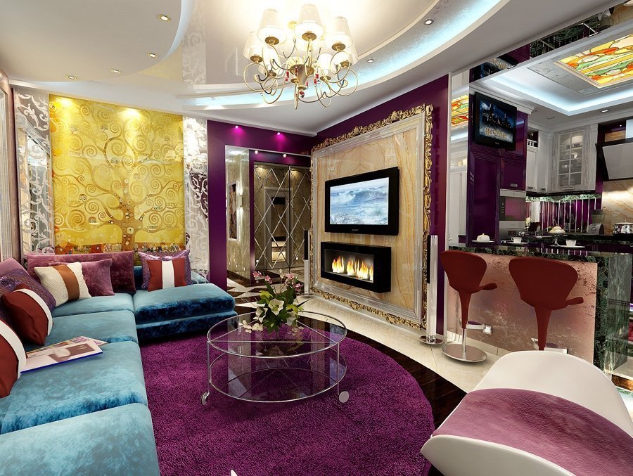 El dormitorio está dominado por tonos neutros (azul, dorado, gris) con un par de acentos brillantes. Recuerde que están descansando en esta habitación, lo que significa que la atmósfera debe crearse en consecuencia. No hay requisitos estrictos para la combinación de colores en la sala de estar, cualquier combinación está permitida aquí a petición de los propietarios.