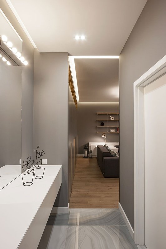 El baño generalmente está decorado en tonos de azul y el pasillo en una paleta de color gris-marrón. No se recomienda combinar más de cuatro colores en el interior. Como resultado, la imagen resultará variopinta y "borrosa", lo que interferirá con la percepción de la habitación como un espacio único. El uso de dos "escenarios" se considera óptimo:
