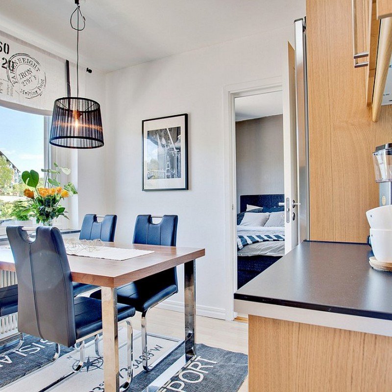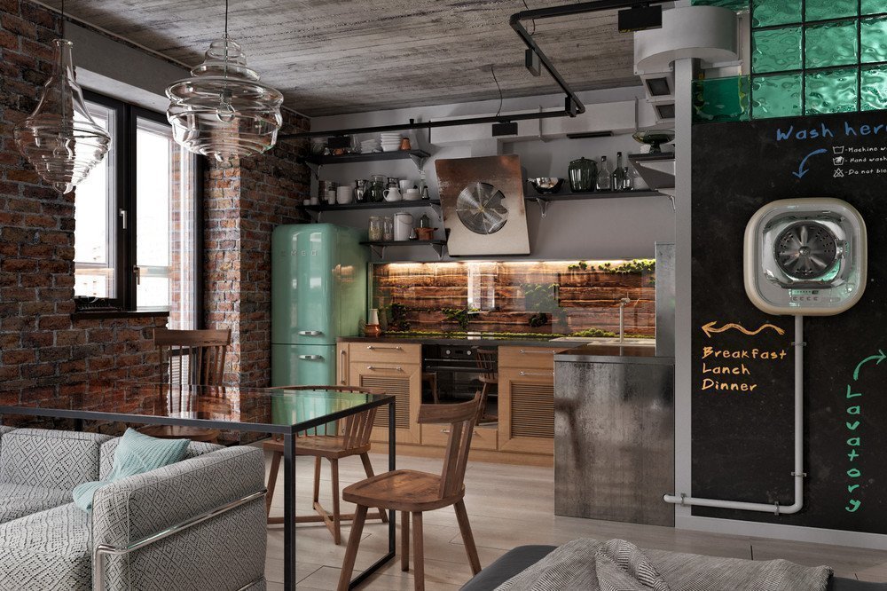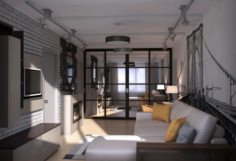 Considere el proyecto de diseño de un apartamento de dos habitaciones, que tiene un dormitorio separado, un baño, un hall de entrada y una espaciosa sala de estar combinada con una pequeña cocina. La dirección principal será la dirección industrial, que es ampliamente popular no solo en su tierra natal (EE. UU.), Sino también en nuestro país.