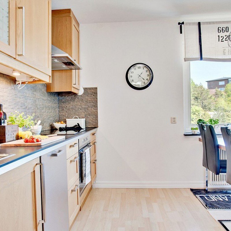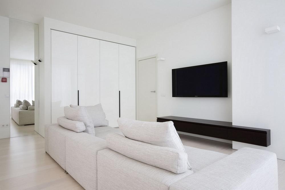 La combinación de cocina y sala de estar tiene un inconveniente significativo en forma de penetración discreta de olores de alimentos y partículas de grasa en una habitación donde no tienen lugar. Sin embargo, es conveniente colocar el comedor en el pasillo, entonces no tendrá que correr lejos con los platos. Acentúo la pared común de las habitaciones debido a la decoración con ladrillos rugosos. También coloca el "centro" condicional, un sistema de almacenamiento abierto. El salón está equipado con un conjunto de muebles con fachadas lacadas en blanco, que se combinan orgánicamente con el resto del acabado de papel tapiz de corcho o chapa de madera.