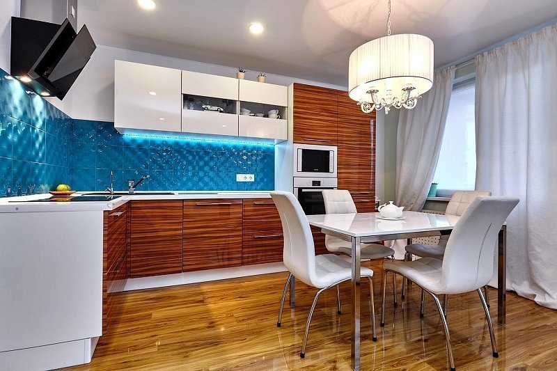 En apartamentos de 65 metros cuadrados, puede crear varias composiciones de color a la vez. Diferirán entre sí, pero reunidos juntos forman una imagen estilística compleja de la casa. Para la cocina, se recomienda elegir tonos cálidos, ya que contribuyen al apetito y se adaptan a las hazañas culinarias.
