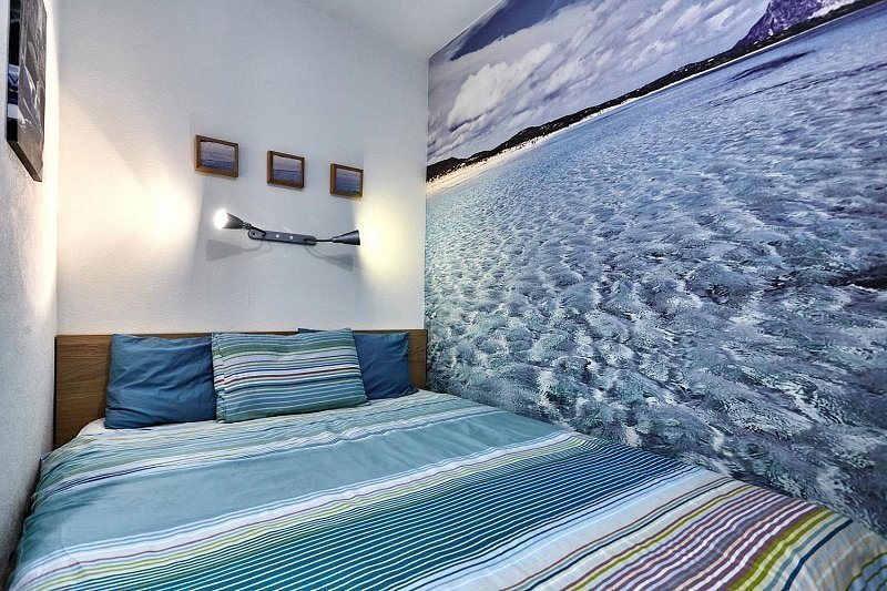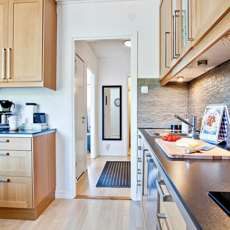 Muebles de uso multifuncional. La mejor opción sería una cama "ático": una litera en la parte superior y debajo de las escaleras un mini armario y un área de trabajo. El baño está revestido de mármol. La bañera y el lavabo superior se acentúan efectivamente con una luz de fondo púrpura. Las fachadas de los gabinetes cerrados están hechas de una combinación de madera blanca y superficies de espejo. Se inserta un espejo ancho sobre el lavabo en el marco de acero. El piso está terminado con azulejos negros. El pasillo está decorado con un estrecho armario corredizo con una superficie de vidrio esmerilado. Un patrón grabado revivirá su fachada. Enfrente pon dos sillas grises o pufs. Las paredes están terminadas con ladrillo blanco en combinación con "madera" negra (paneles de MDF). La decoración se completa incorporando focos en el techo y a lo largo de la superficie de ladrillo en relieve.