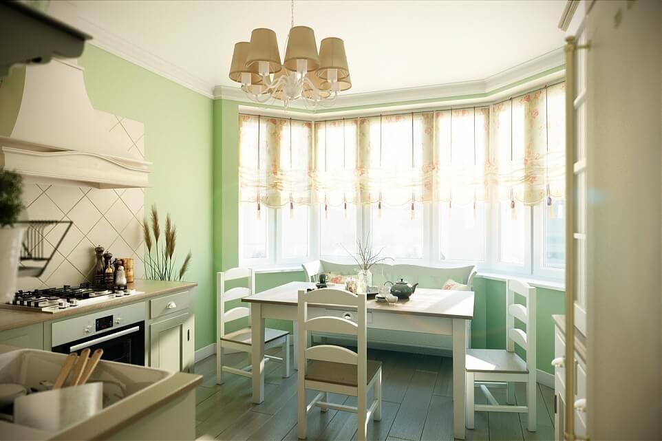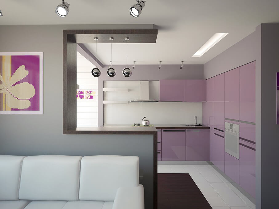 Los alféizares de las ventanas se modifican para las encimeras y les colocan un par de sillas brillantes. La decoración se completa instalando un sofá en forma de L, que "mira" hacia la cocina. Como decoración, use un grupo de lámparas que cuelgan sobre el área de trabajo junto a la ventana y una composición de mini focos en el techo.