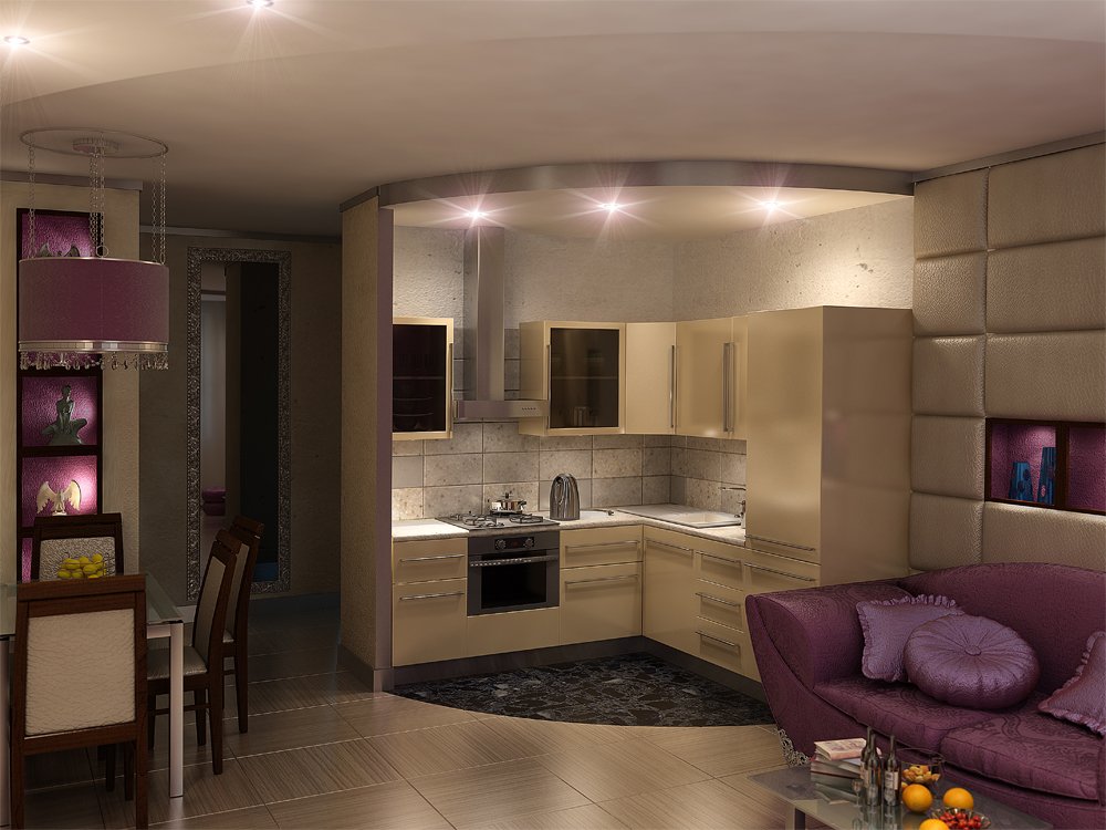 La decoración utiliza yeso simple y papel tapiz blanco en combinación con áreas grises para agregar acentos. Un sofá de esquina con tapicería de cuero en color leche se coloca entre la ventana y la pared. Por el contrario, tienen un sistema de almacenamiento cerrado con un nicho para un televisor. El centro de la composición será una mesa cuadrada de vidrio. Las ventanas están colgadas con tonos fríos (azul, azul, morado).El piso está cubierto con una alfombra de color neutro con un pelo corto. En la cocina encarnan un estilo similar al minimalismo: alta tecnología. Como la habitación es pequeña, la ubicación del juego de cocina se elige en paralelo, a lo largo de dos paredes. Sistemas de almacenamiento combinados, con una ventaja en la dirección de estantes abiertos. Gris, blanco, negro y marrón claro prevalecen en tonos en la mejor tradición de alta tecnología. Superficies cromadas y detalles de muebles de metal completan la imagen.