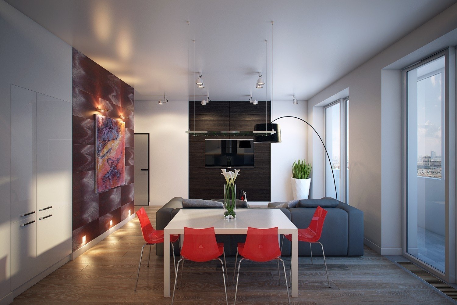 Si hay acceso a la logia, se combina con un dormitorio y se formaliza como un área de relajación adicional. La habitación utiliza una decoración de pared simple, una abundancia de blanco combinado con marrón. El énfasis estará en la pared en la cabecera de la cama con una superficie elevada, cuyos contornos se enfatizan por las fuentes de luz direccional. El hall de entrada está decorado de acuerdo con los principios del minimalismo en colores blanco y negro: una percha, un banco para zapatos, un armario y un espejo en la pared. En el baño, se usa una combinación de rojo y gris. En la decoración del piso y las paredes use un azulejo liso. Los mangos, grifos y soportes para toallas, papel, se seleccionan en tonos rojos. El toque final en la composición interior será un falso lavabo hecho de mármol gris o negro.