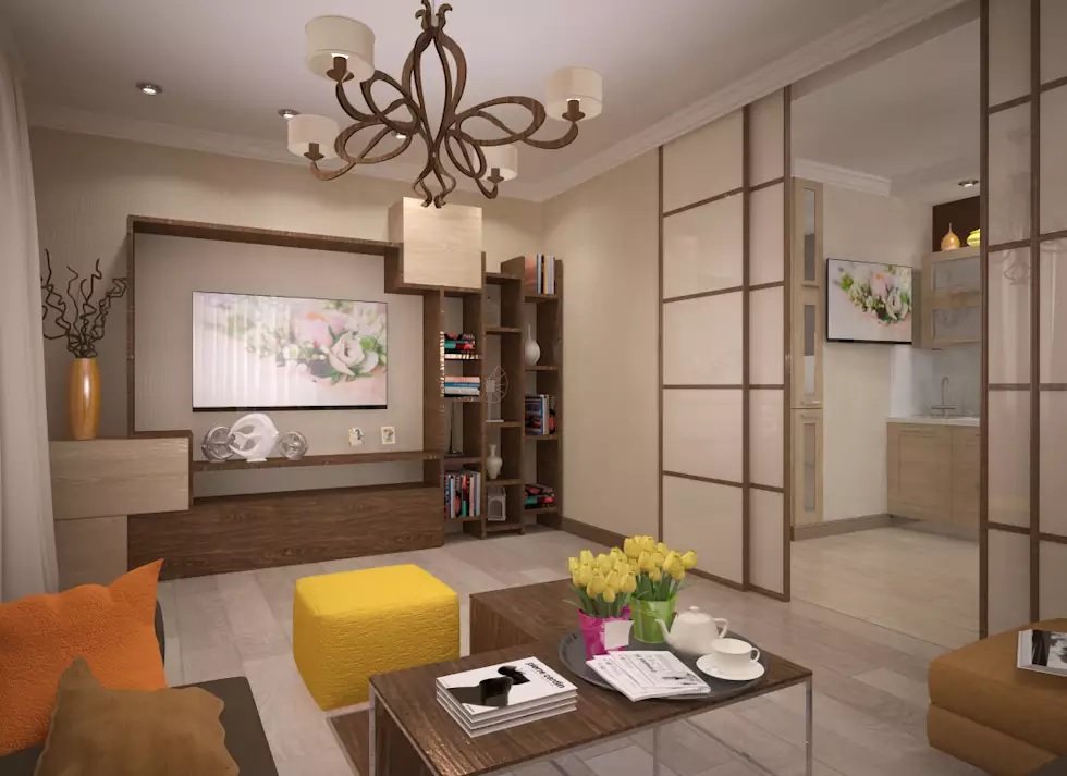 La cocina está separada del salón por la barra. El diseño de esta sala se basa en el minimalismo: un conjunto de la misma sombra "arbolada" que las paredes del pasillo, una mesa, un par de sillas y una lámpara de araña en el techo original. Para que el juego de cocina y sala de estar no se vea aburrido, se le agrega un color de acento, que está presente en los detalles.El dormitorio utiliza un mínimo de muebles, ya que la mayor parte de la habitación estará ocupada por una cama ancha. Frente a él, se instala una cómoda larga y estrecha para un televisor y un estante de esquina.