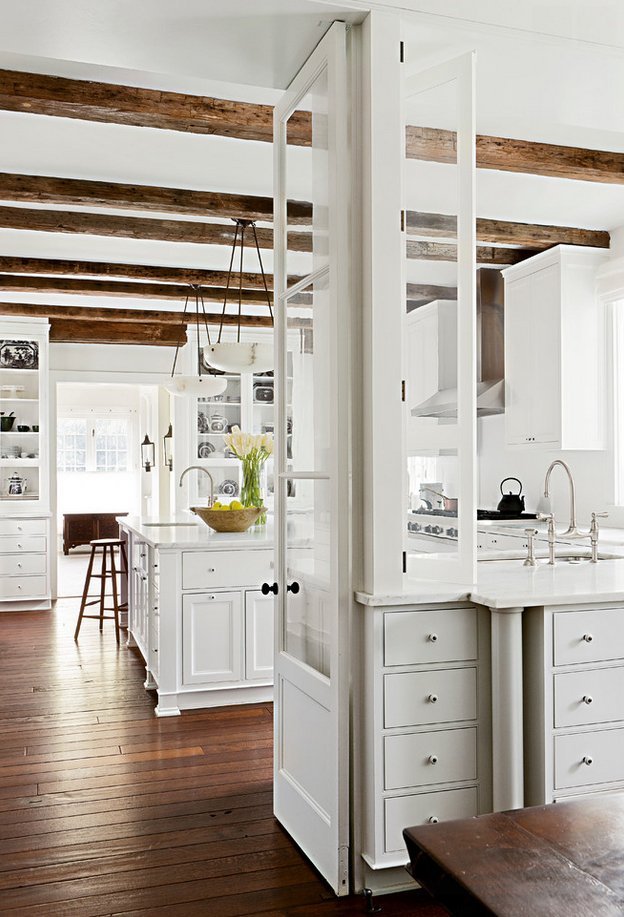 Una de las técnicas de decoración que reduce el nivel general de la altura de la habitación es el uso de vigas abiertas. Las estructuras de madera amuralladas en las paredes, pintadas con tintes oscuros, se encuentran mucho más bajas que el techo principal. Contra su fondo claro, las vigas crean un adorno voluminoso que llena la parte superior del espacio. Aplique opciones lineales y diagonales, así como cruces en ángulos rectos. En casas particulares estilo chalet, los troncos sólidos se pueden usar como vigas, y los triángulos del país apoyarán el estilo rural.
