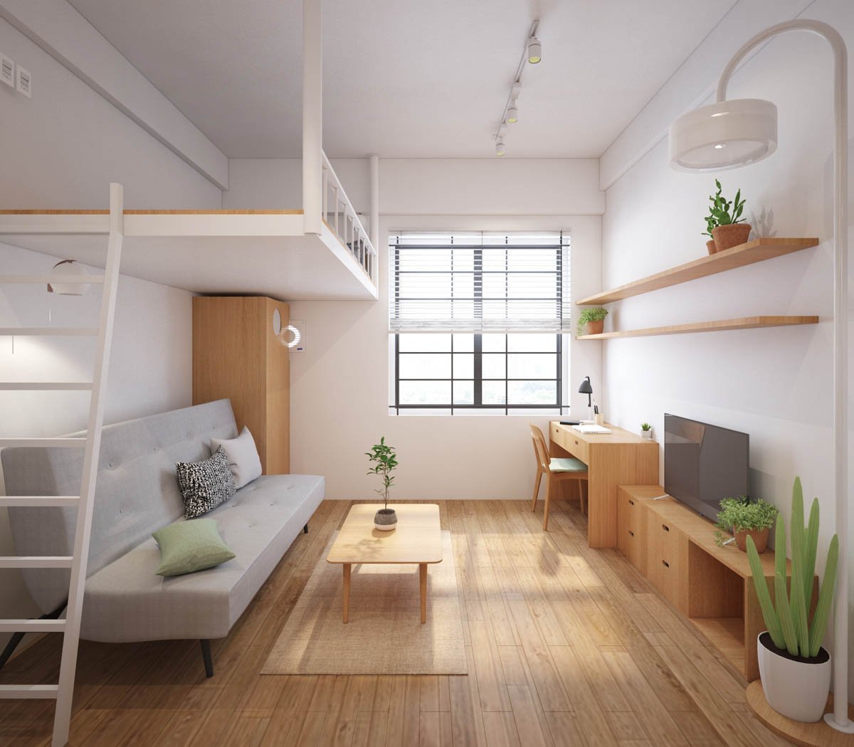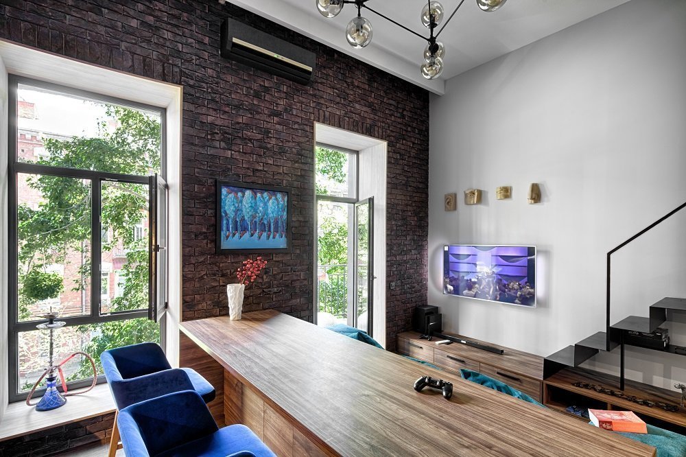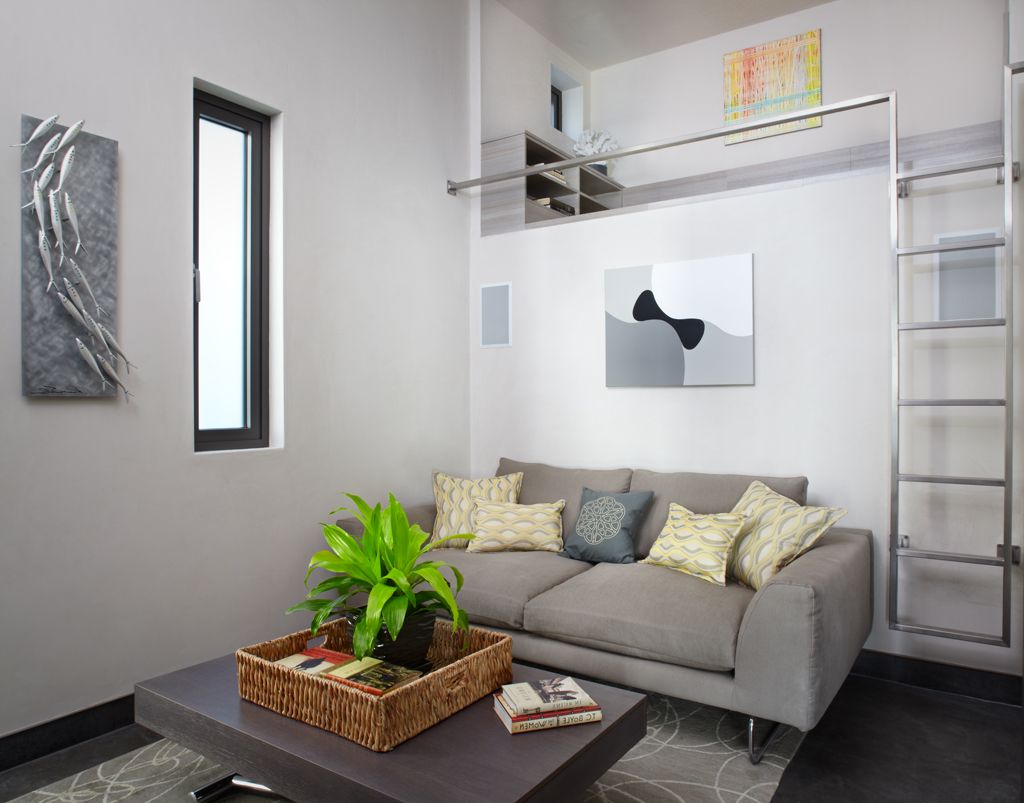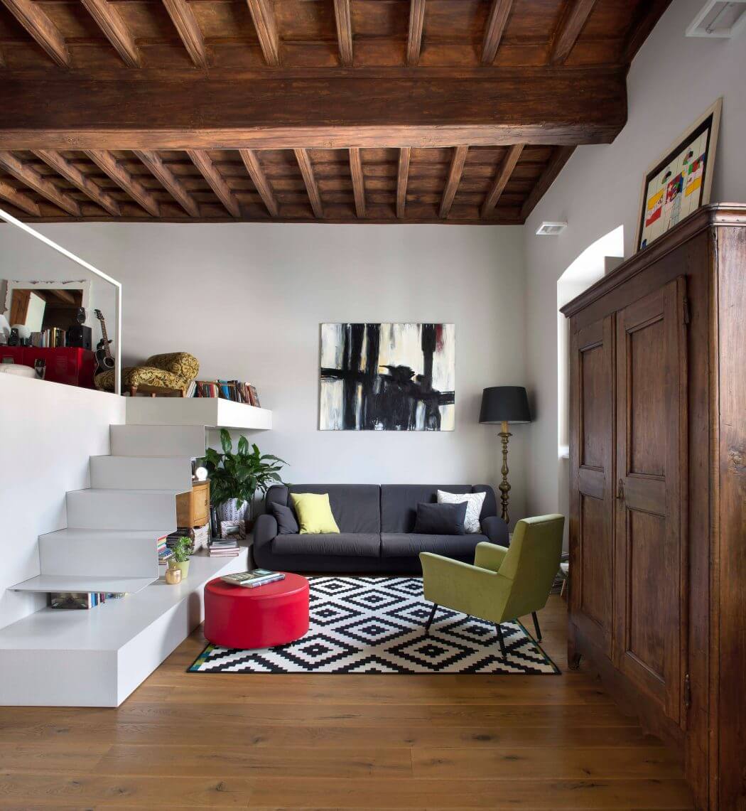 Al organizar un apartamento con techos altos, es necesario prestar atención no solo a las direcciones horizontales y verticales, sino también al volumen que sube. Una decisión de diseño interesante en las casas de los edificios prerrevolucionarios puede ser la división de todo el espacio en 2 niveles. Esta técnica es relevante para estudios pequeños con una altura de techo de 4.5 metros o más. Habiendo dado a la sala la parte delantera con una gran ventana delantera, la trasera está diseñada en dos niveles. En el primer piso hay una cocina-comedor y un baño de un pequeño metraje, el área para dormir se eleva más alto. El entrepiso está cercado con una barandilla, que lo conecta a la planta baja con una escalera.