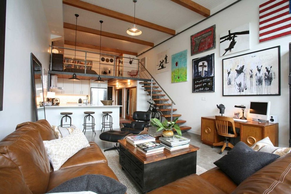 Un techo alto le permite decorar cualquier habitación con obras de arte dimensionales. Pueden ser lienzos individuales, pinturas modulares, fotografías en una densa "alfombra" colgando, carteles, instalaciones modernas, bajorrelieves, paneles, murales, elementos de graffiti.