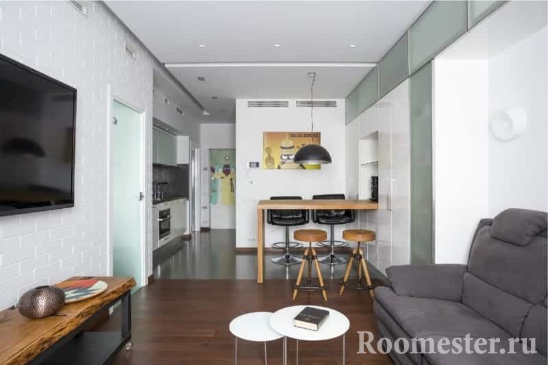 Hoy en día, una solución funcional, práctica y moderna ha sido utilizar el diseño de un apartamento tipo estudio de 30 metros cuadrados. A menudo hay un diseño de un apartamento de 21 metros cuadrados, donde se combina una habitación con la cocina. La opción de reurbanización en un apartamento, puede ocurrir de una manera más cardinal, combinando en una habitación grande no solo una habitación con cocina, sino también conectando un balcón, un pasillo, un trastero. El espacio se divide utilizando la zonificación condicional en las zonas funcionales necesarias.