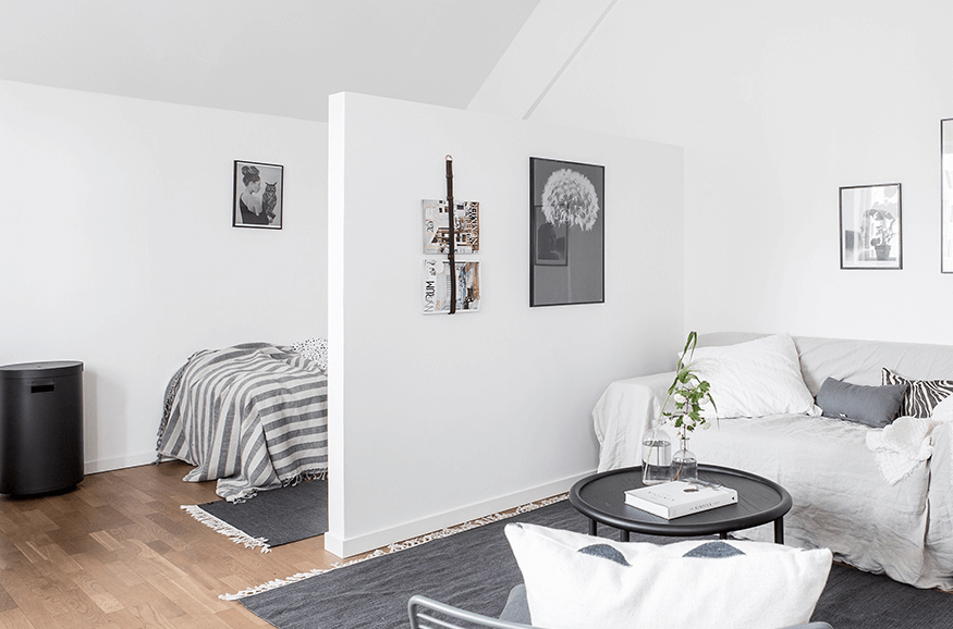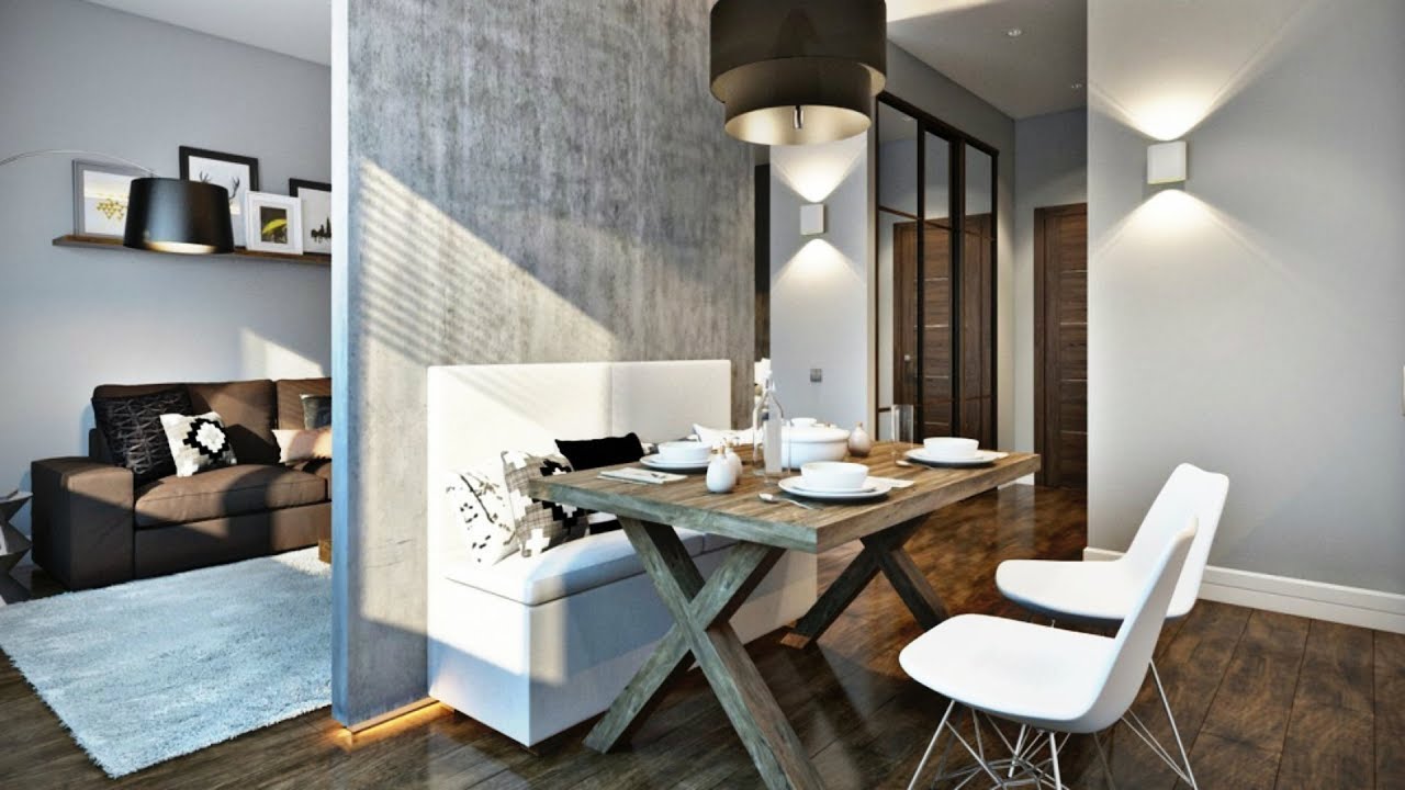 En estudios o apartamentos con un diseño modificado, solo se utilizan particiones claras o zonificación condicional. Las paredes monumentales dividirán la habitación en pequeñas zonas separadas, que serán muy difíciles de vincular en una sola composición. Además, el espacio se verá como un rompecabezas ensamblado a partir de fragmentos separados;