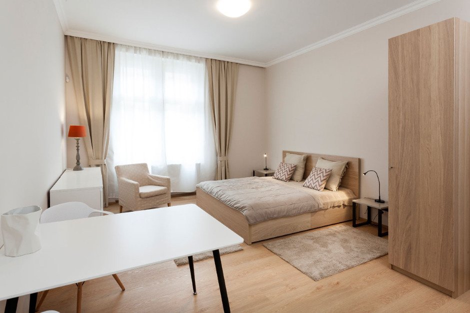 Cada persona quiere tener a su disposición una cama espaciosa y lujosa, donde pueda dormir en cualquier posición cómoda sin el riesgo de caer al piso. Una cama grande para un apartamento pequeño no es la mejor solución. Desafortunadamente, ocupará demasiada área utilizable, lo que no está permitido en condiciones de escasez de medidores. Por esta razón, es mejor dar preferencia a un sofá plegable. Si hay suficiente espacio, en el área de dormir colocan un armario deslizante con puertas correderas ergonómicas. Las opciones de swing no se consideran en absoluto. La habitación está decorada tradicionalmente en colores brillantes. Para la decoración, se utilizan materiales hipoalergénicos naturales. Madera óptima y sus derivados seguros, en cuya fabricación no se utilizaron compuestos de unión tóxicos. En estilos claros (provenza, shabby chic, clásico) se utiliza papel tapiz con motivos florales. El piso está terminado con laminado o tablero de parquet.