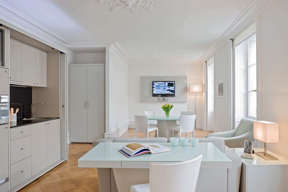 Entre la cocina y la sala de estar, es conveniente colocar un área de comedor, que servirá como un "amortiguador".