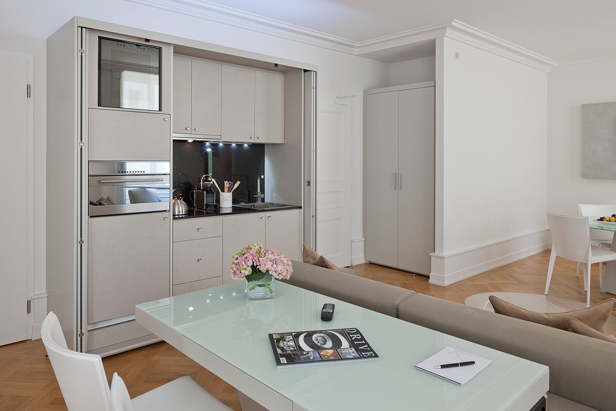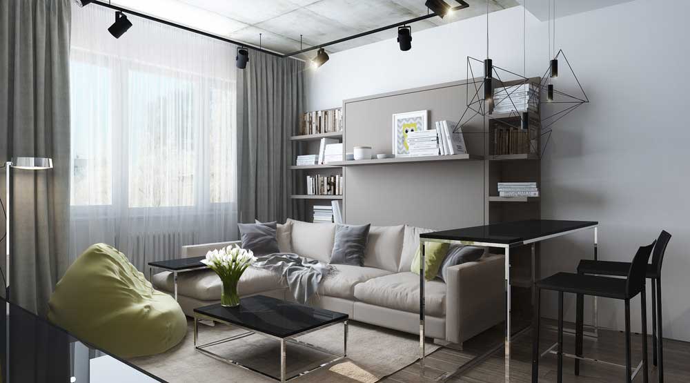 Utilizar muebles multifuncionales. La cama se convierte en un sofá compacto, la encimera se fija directamente a la pared, los sofás se pliegan y los armarios empotrados esconderán los defectos de la forma no estándar de la habitación y le permitirán usar más espacio para organizar el sistema de almacenamiento;