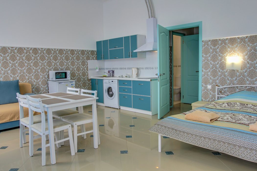 El diseño generalmente se realiza en habitaciones espaciosas, pero en el estudio la cocina se puede separar de la sala de estar con la ayuda de un bar o encimera, que se convierte en un comedor.
