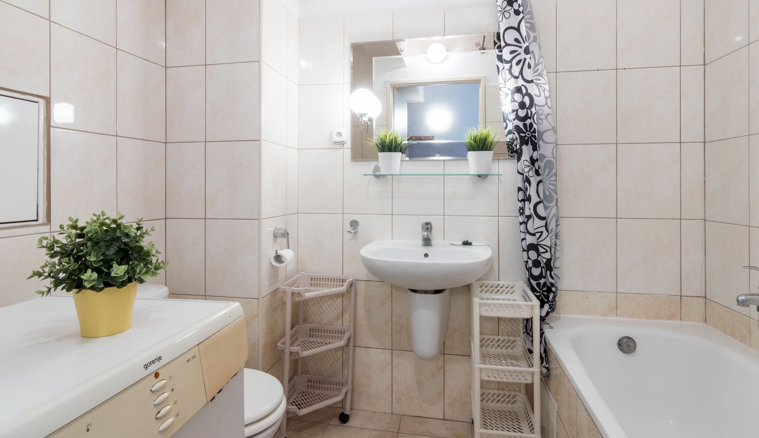 El baño es de baldosas, piedra artificial o plástico.Es mejor usar el fregadero como un fregadero, ya que el tazón liberará espacio de almacenamiento en el gabinete debajo de él. Además, tal solución se ve elegante e inusual en alta tecnología, estilo ecológico, dirección escandinava, minimalismo. El baño se abandona en favor de una ducha compacta. Si la habitación no difiere en grandes dimensiones, utilice un sistema de almacenamiento de gabinetes colgantes estrechos. En los baños combinados, el inodoro se separa del resto del espacio mediante una partición opaca de vidrio o plástico. Techo elegir un tramo. Esta opción protegerá la habitación de las inundaciones desde arriba y enfatizará el estilo del interior.