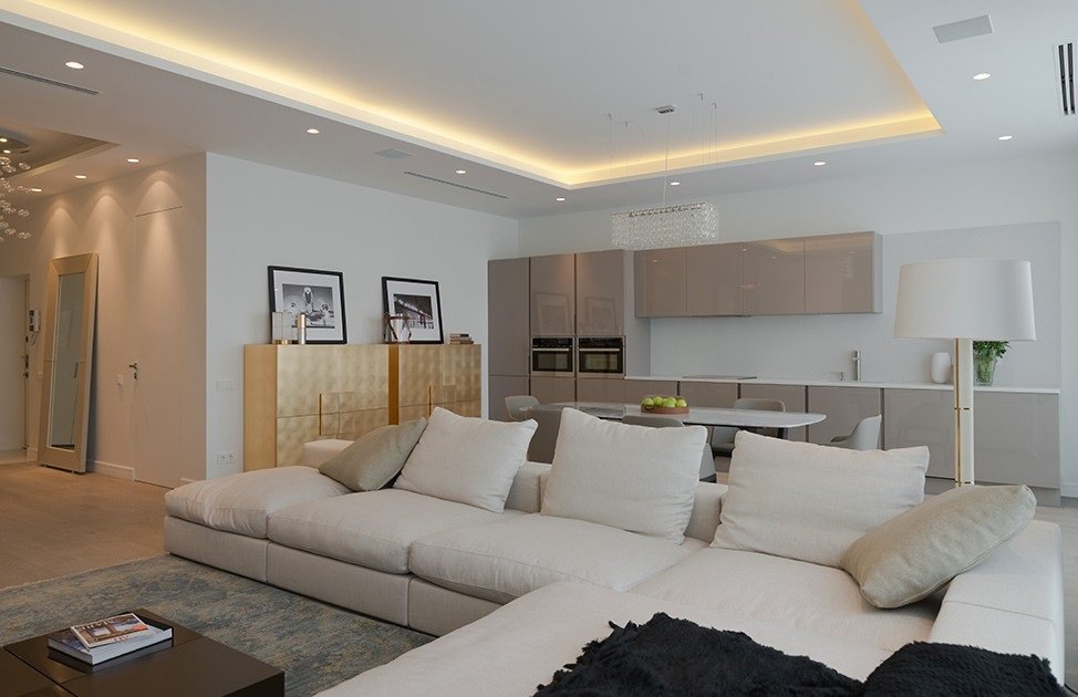 Los colores claros prevalecen en el esquema de color. Una excepción solo puede ser una decoración de acento brillante y un piso oscuro (en presencia de techos altos). En las áreas modernas, usan tonos "sabrosos" que son similares a un soplo de aire fresco: oliva, menta, mandarina, mostaza, cereza, nuez. En interiores clásicos, se toma como base la escala marrón en toda su variedad: café con leche, beige, caoba, terracota, chocolate, vainilla, color ocre. En los estilos de alta tecnología, se utiliza una combinación de blanco con gris oscuro (asfalto) y gris claro (abaliotis, plateado).También en la paleta aplicar azul, amarillo, rosa, verde, coral. Si hay poca luz natural en la habitación, entonces se hace más cómoda debido al rango cálido. Los tonos fríos, por el contrario, son adecuados para habitaciones cuyas ventanas dan al lado soleado.