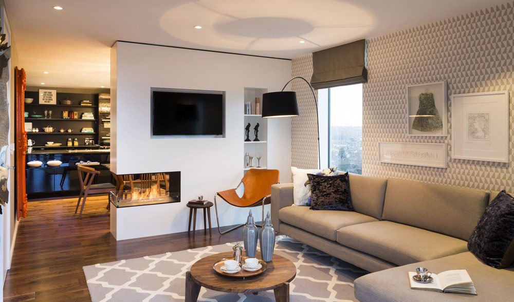En el sofá de la sala, un par de puffs y una mesa de café son suficientes para una estancia confortable. Frente al juego de muebles, se instala un estante grande con un nicho para un televisor en el centro. En el estilo loft, la pared decorativa está terminada con ladrillo o mampostería de colores claros. El color marrón tradicional del material puede reducir visualmente el espacio. Los paneles de madera y plástico se verán bien en combinación con un interior clásico y moderno, respectivamente. El papel pintado y el estuco veneciano en relieve acentúan el entorno sólido.