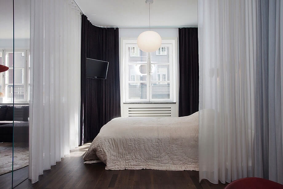 Una opción simple y de bajo costo de zonificar el dormitorio es separar la cama con una cortina.Solo necesita comprar rieles especiales en los que se montarán las cortinas e instalarlas en el techo. La instalación de rieles no es posible en techos suspendidos, pero hay otra opción para colocar cortinas: deberá instalar soportes en los que se unirán las cornisas.