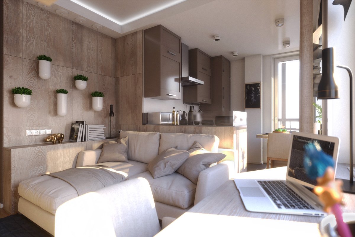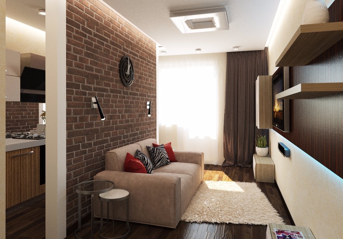 Es deseable que el diseño de un estudio sea de 36 metros cuadrados. m contenía tonos claros, "no aplastantes". Todo el interior en un esquema de color se ve demasiado aburrido sin la adición de acentos de color. Los acentos pueden ser almohadas decorativas de sofá brillantes, pinturas, fotos familiares en el marco, objetos pequeños: flores de interior, relojes de pared. Un gran acento será el fondo de pantalla panorámico. Un ejemplo del diseño correcto es el estilo escandinavo: el color blanco y sus tonos siempre prevalecen aquí, pero un proyecto de diseño similar no parece monótono en absoluto. De la misma serie, el estilo loft: puede combinar el minimalismo con un estilo de diseño moderno.Aunque el loft generalmente está acompañado de interiores de ladrillo gris o naranja, en las casas modernas al decorar espacios de vida con un pequeño metraje, las paredes a menudo están decoradas con paneles decorativos ligeros que imitan los ladrillos.