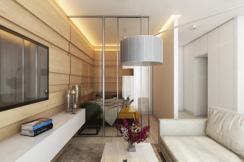 Las puertas correderas o el acordeón también encajan perfectamente en el diseño de un apartamento de treinta y seis metros cuadrados. Puedes comprar puertas de vidrio, totalmente transparentes o translúcidas.