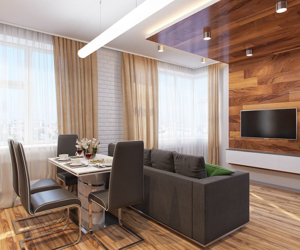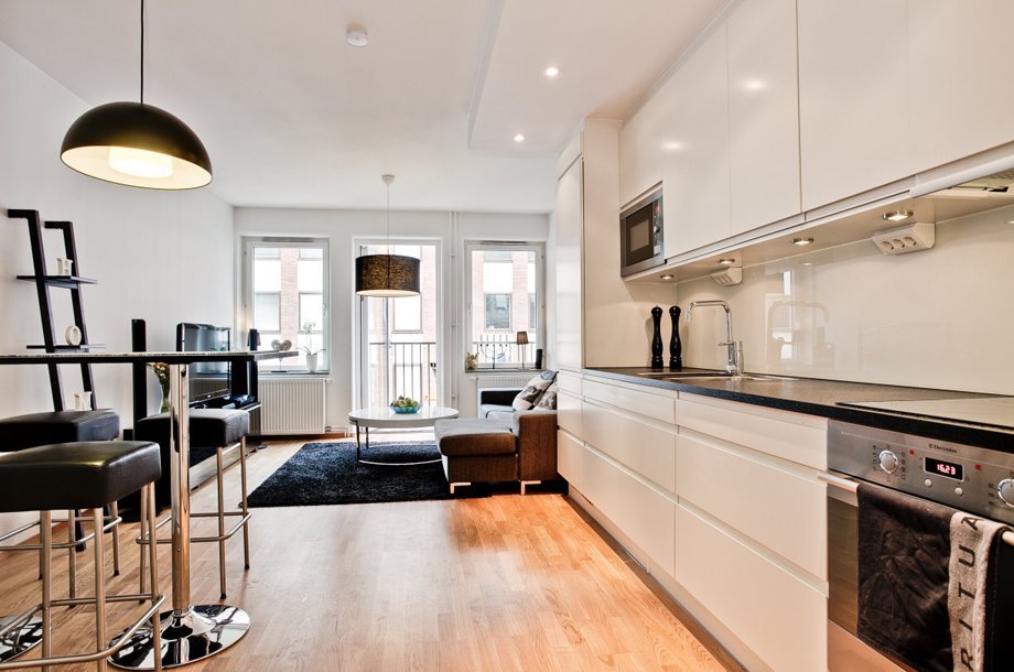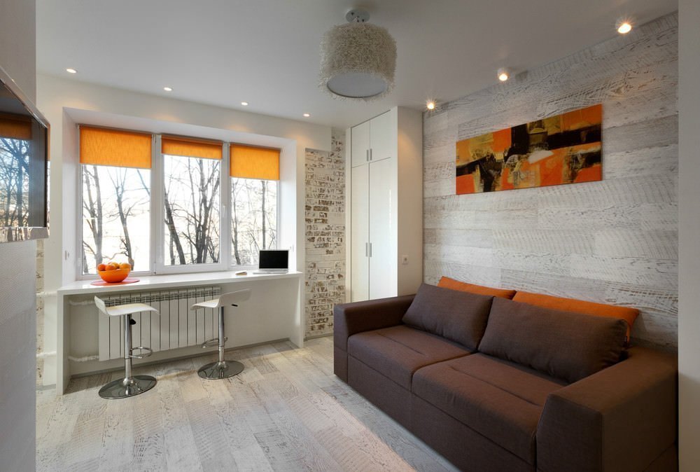 Una pequeña cocina de 5-6 metros cuadrados no permite acomodar a un grupo de comedores de pleno derecho, por lo que muchos propietarios lo combinan con una sala de estar. Aunque tal movimiento no le permitirá acomodar una mesa de comedor completa sin perjuicio de otras áreas, al combinar la cocina y la sala de estar, aparecen más oportunidades para organizar el espacio. Después de establecer una barra de bar, el propietario atrapa dos pájaros de un tiro: el bar delimita la cocina con el pasillo, sirve como lugar para una comida y una superficie de trabajo al mismo tiempo. Después de instalar un pequeño gabinete vertical debajo del mostrador, aparecerá espacio de almacenamiento adicional.