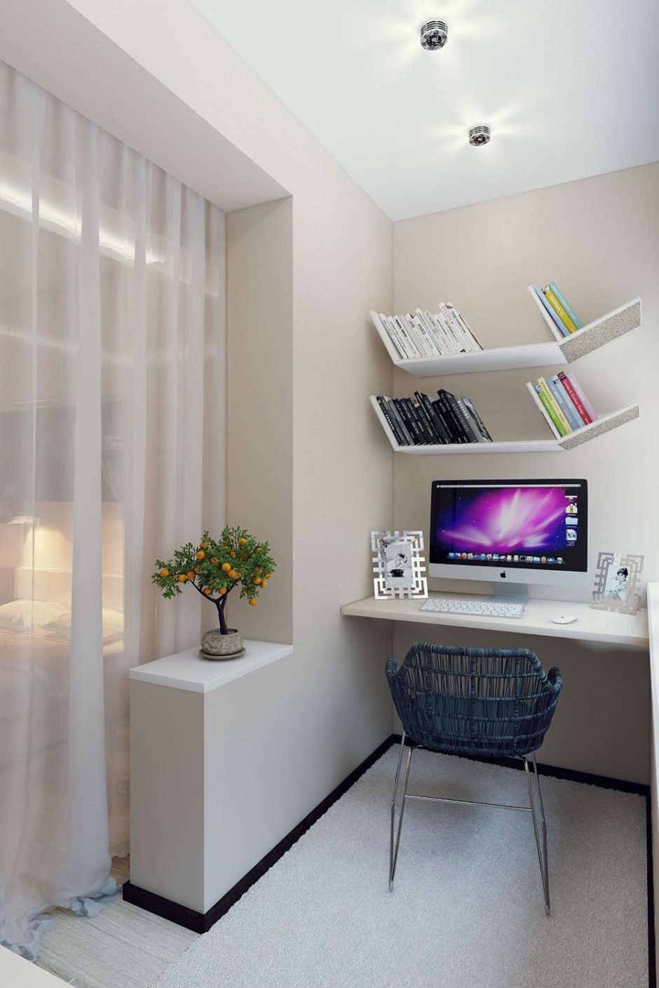 El área de los balcones es bastante modesta, a menudo no supera los 4 metros cuadrados. m, pero en un pequeño apartamento de una habitación cada metro cuenta. El balcón se puede acristalar, después de haber dispuesto un lugar de almacenamiento adicional, para instalar gabinetes, bastidores en los que se almacenará todo lo que no se pudo encontrar en los apartamentos. Si aísla el balcón y demuele la partición, aparecerán medidores residenciales adicionales en los que puede organizar un lugar adicional para relajarse colocando un sofá o un par de sillones con una mesa de café, o puede organizar una oficina en la nueva plaza. No es necesario demoler toda la pared: es suficiente quitar las puertas del balcón con ventanas, en este caso aparece una partición de demarcación baja. Al mismo tiempo, es un lugar de almacenamiento adicional en el que las macetas con flores frescas o libros se verán geniales. Si hay un alumno en la familia, el lugar de trabajo para él es excelente.