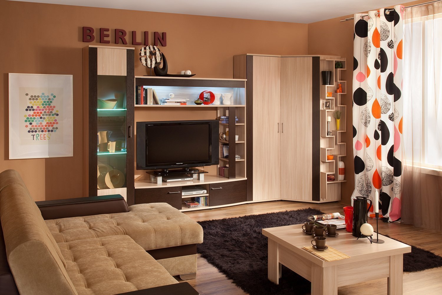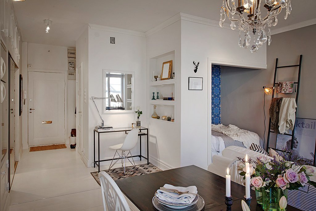 Con un área pequeña, no puede usar elementos grandes de la decoración (jarrones de piso, figuras, etc.), es mejor llenar metros cuadrados con muebles y usar pequeños objetos colocados en estantes o pinturas murales como decoración.